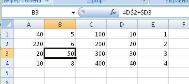 В итоге в ячейке B3 имеем формулу: =D$2+$D3