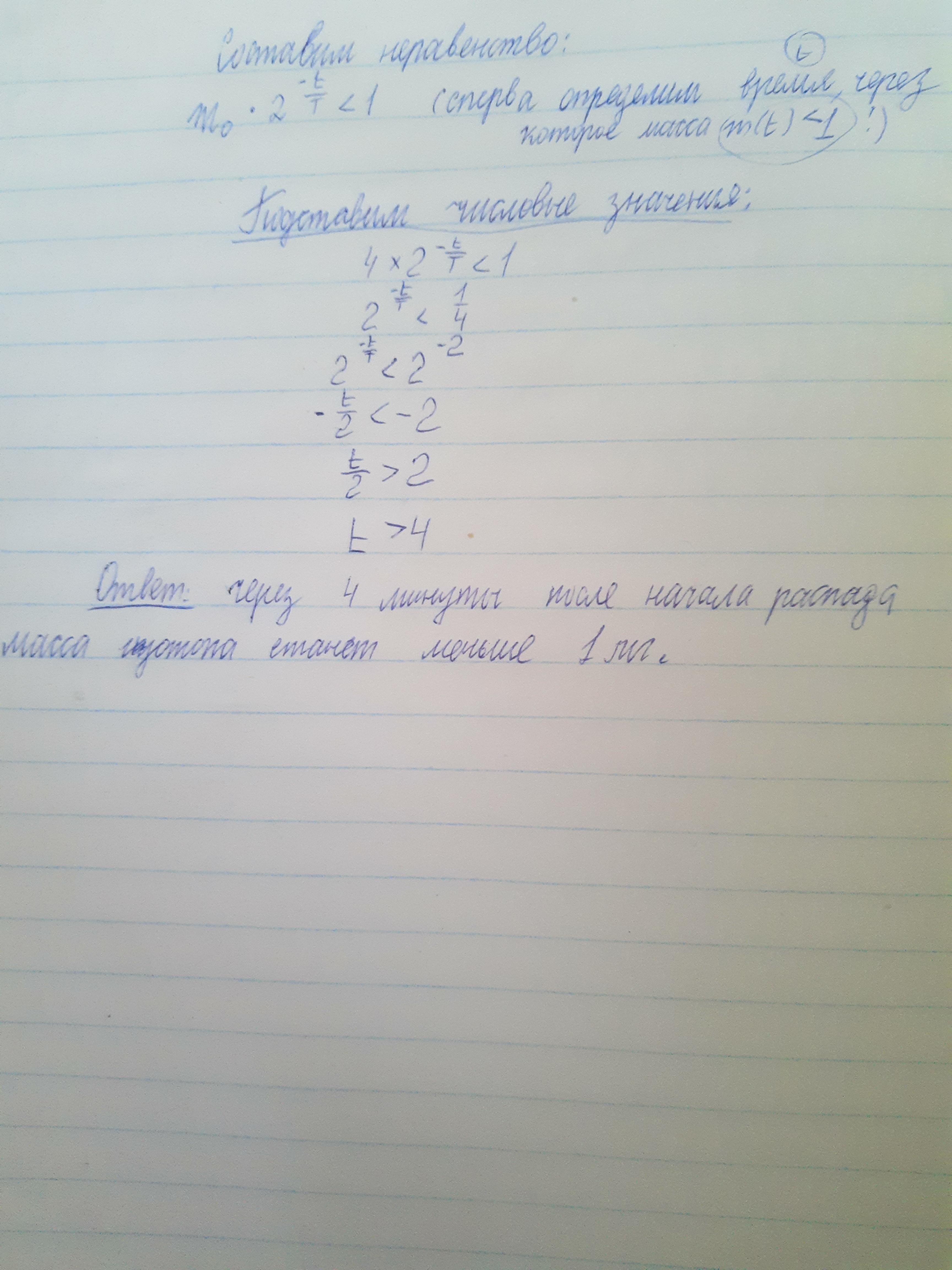 В ходе распада радиоактивного изотопа его масса уменьшается по закону m (t)= m^0×2^-t/T, где m^0 – начальная масса изотопа Z, T (мин) – период полураспада. В лаборатории получили вещество, содержащее в начальный момент времени m^0 =4 мг изотопа, период полураспада которого T =2 мин. Через какое время после начала распада масса изотопа станет меньше 1 мг?