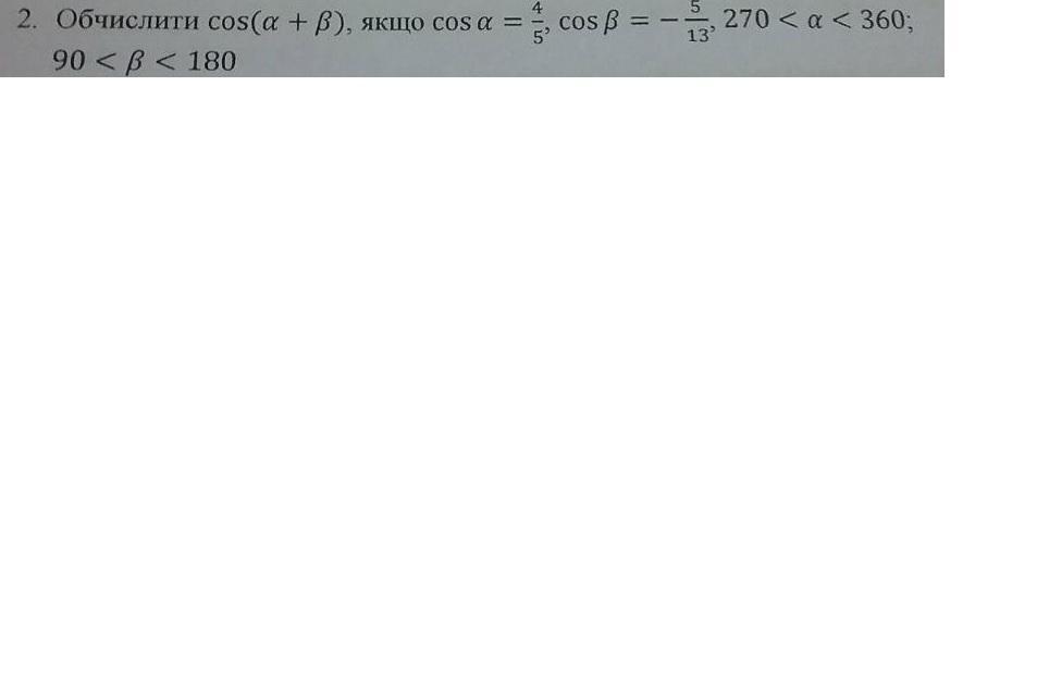 cos (α + β) = 4/5 · (-5/13) - (-3/5) · 12/13 =