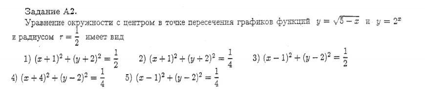Уравнение окружности с центром в точке пересечения графиков функций y=√5-x у= 2^x и радиус r=1/2 имеет вид