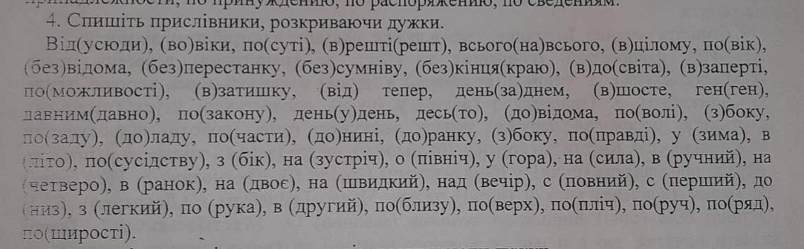 відусюди, вовіки, по суті, врешті-решт, всього-навсього, в цілому, повік, без відома, безперестанку, без сумніву, без кінця-краю, вдосвіта, взаперті, по можливості, в затишку, відтепер, день за днем, вшосте, ген-ген, давним-давно, по закону, день-у-день, десь-то, до відома, поволі, збоку, позаду, до ладу, почасти, донині. до ранку, збоку, по правді, узимку, влітку, по-сусідству, збоку, назустріч, опівночі, угору, насилу, начетверо, вранці, надвоє, нашвидко, надвечір, сповна, спершу, донизу, злегка, поруч, вдруге, поблизу, поверх, попліч, поруч, поряд, по щирості.