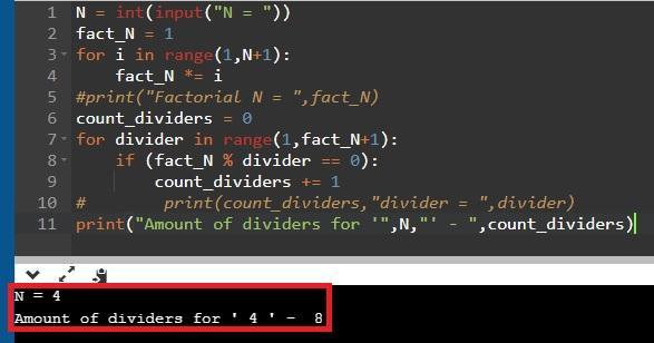 Например, при N=4, N!=4⋅3⋅2⋅1=24. Это число имеет следующие делители: 1,2,3,4,6,8,12,24. Таким образом, искомое количество составляет 8.