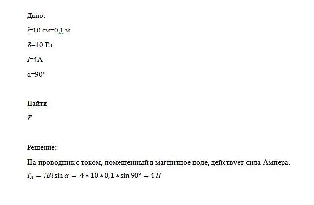 Вычислить силу магнитного поля, действующую на проводник длиной 10 см. Сила тока, протекающая по проводнику, равна 4А. Проводник расположен перпендикулярно силовым линиям магнитного поля, индукция которого равна 10 Тл.