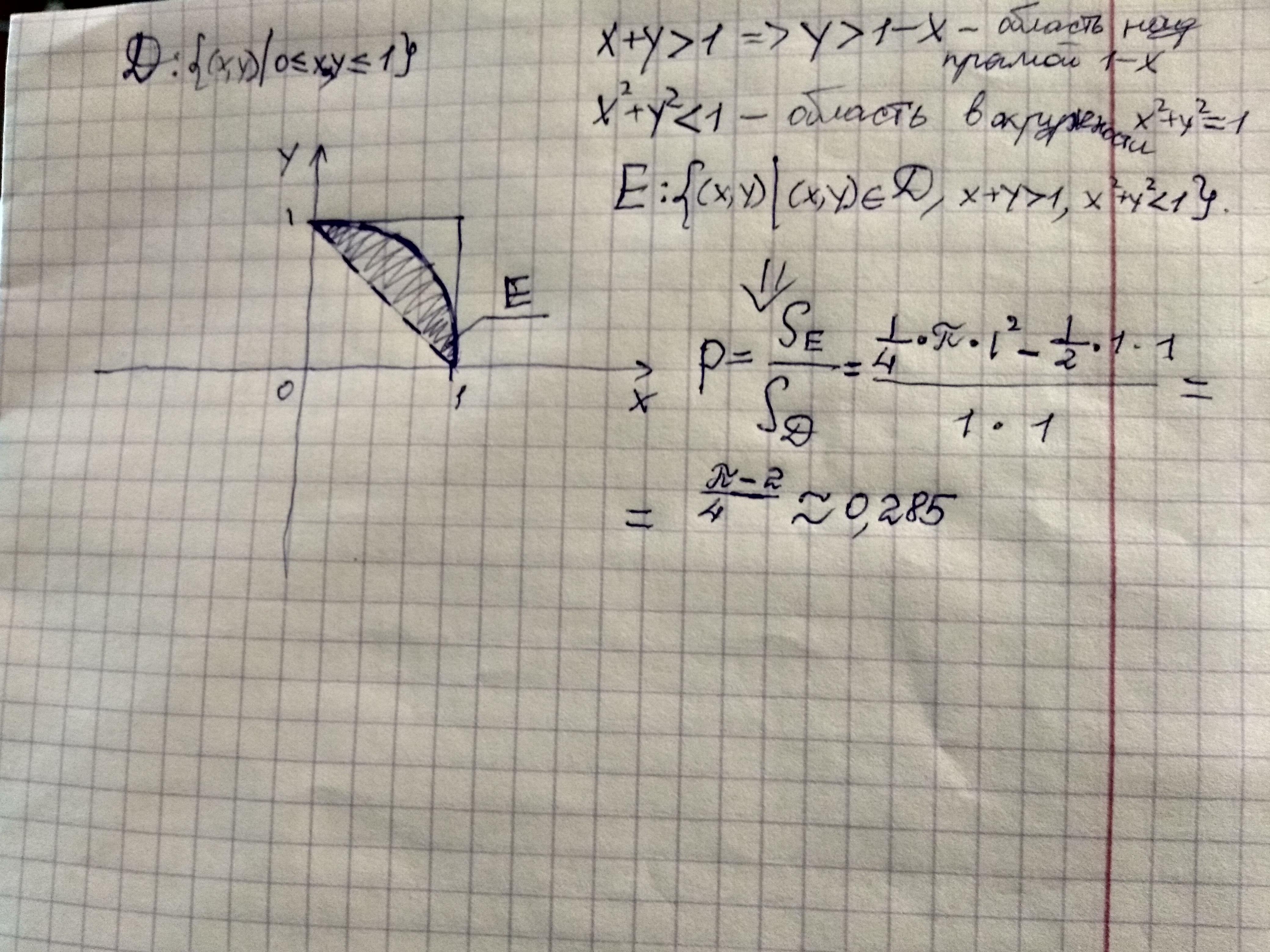 из промежутка [0, 1] наудачу выбраны два числа. какова вероятность что их сумма больше единицы , а сумма квадратов меньше единицы
