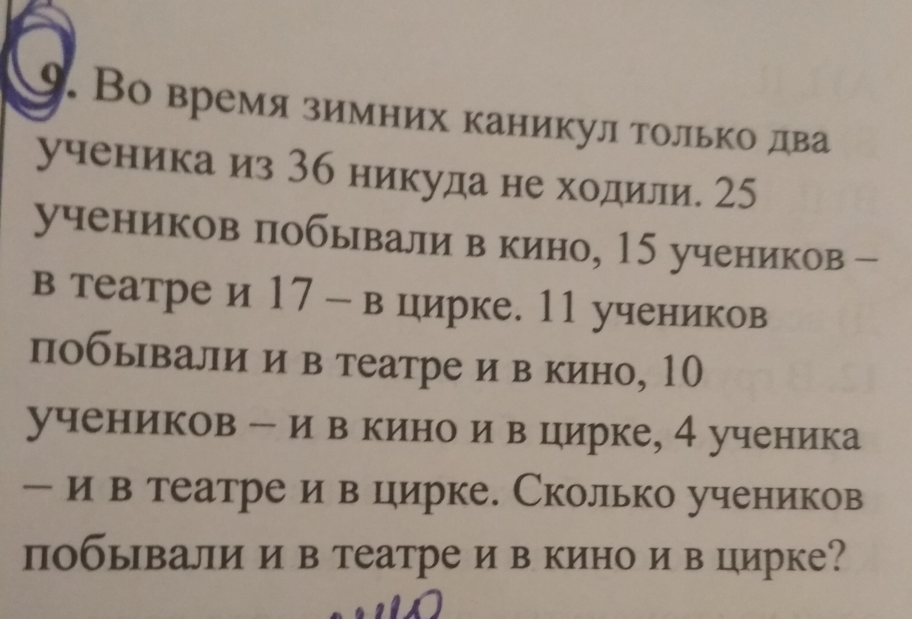 Двое ребят по условию не ходили ни в кино, ни в театр, ни в цирк. Поэтому мы исключаем их из общего числа учеников: