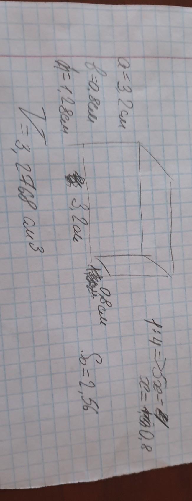 V = 0,8 * 3,2 * 1,28 = 3,2768 см³