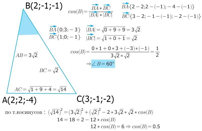Знайдіть величину кута В трикутника АВС, якщо А (2; 2; -4), В(2; - 1; - 1), С(3; - 1; - 2).