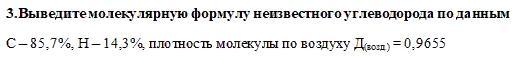 С= 85,7%, Н = 14,3 % плотность углеводорода по воздуху 0,965