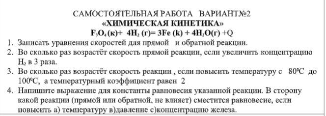 3. Во сколько раз возрастет скорость примой реакции если повысить температуру с 80 до 100°, температурный коэффициент равен 2 Δ Т = 100 - 80 = 20 ΔТ/ 10 = 2 2² = 4 Скорость возрастет в 4 раза