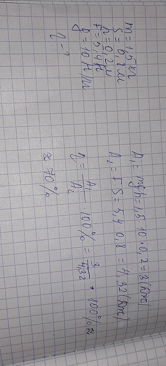 Груз, масса которого 1,5 кг, ученик равномерно переместил к вершине наклонной плоскости длиной 0,8 м и высотой 0,2 м. При этом перемещении сила, направленная параллельно линии наклона плоскости, была равна 5,4Н.