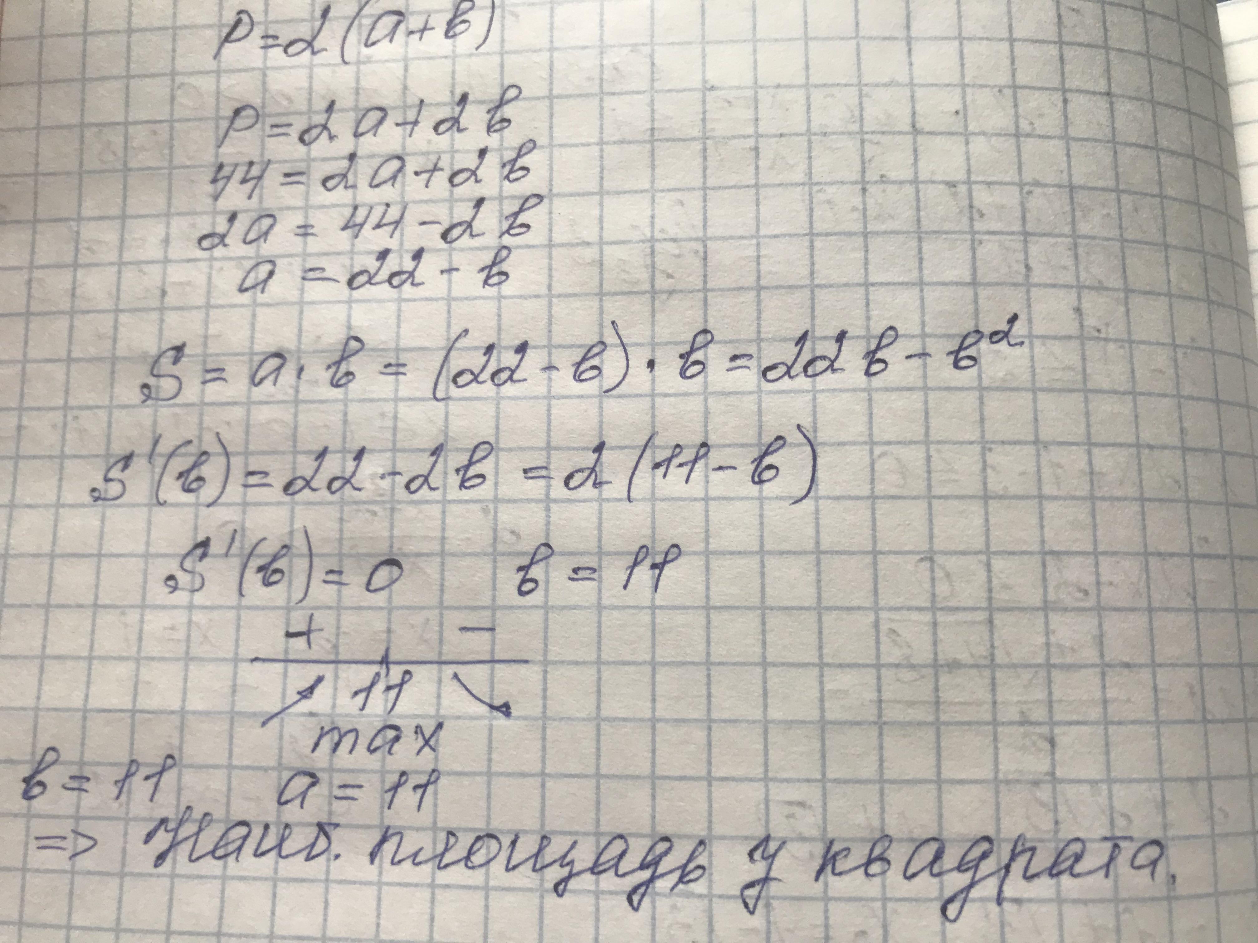 Периметр прямоугольника составляет 44 см. Каковы его стороны, если этот прямоугольник имеет наибольшую площадь?