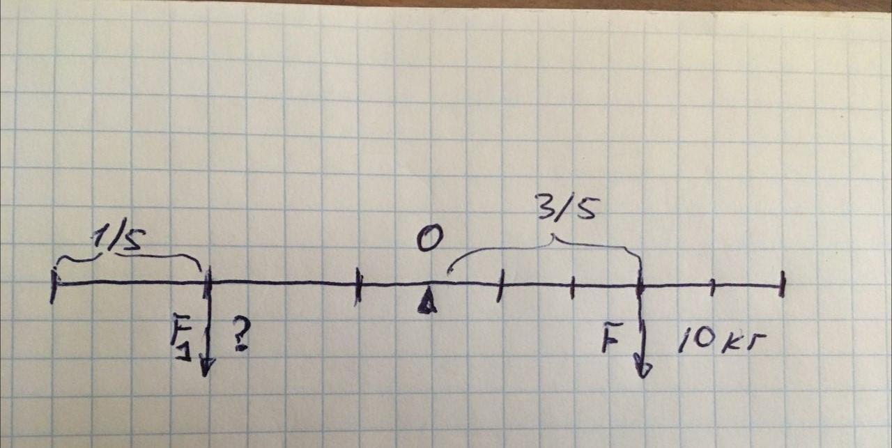 Какую сижу нужно приложить,чтобы уравновесить рычаг длинной 20 см, если на правое плечо подвесили груз массой 10 кг, действующий на расстоянии равном 3\5 от точки опоры. Расстояние от левого конца рычага до неизвестной силы равна 1\5 от длины рычага. (Нарисуйте рисунок)