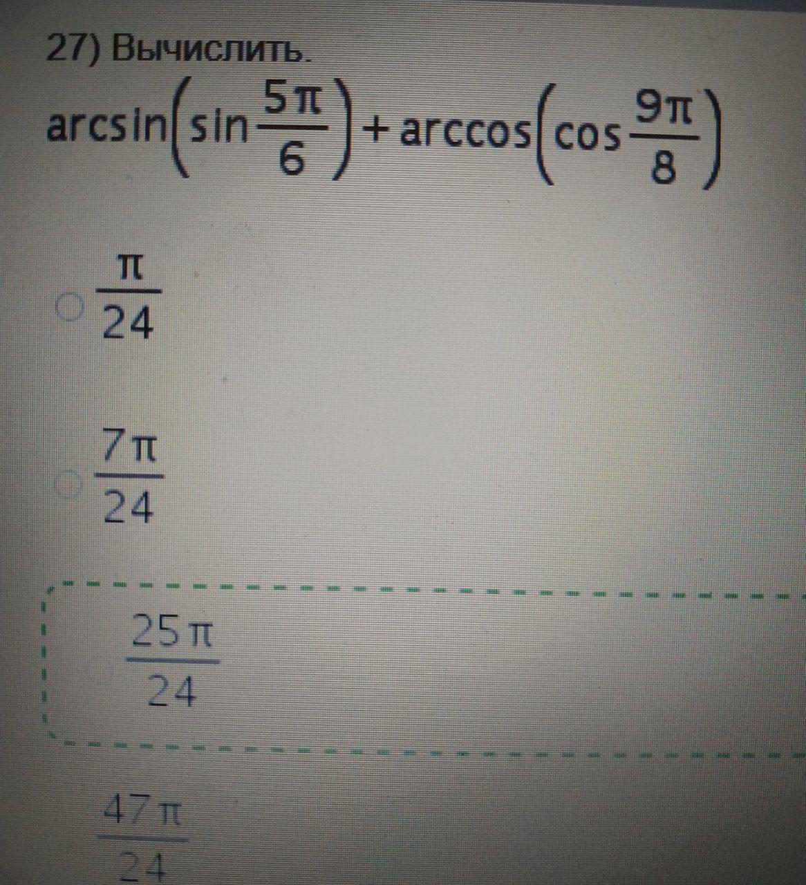arcsin(sin 5п/6) + arccos(cos 9п/8)= 5п/6 + 9п/8=(5п*4 + 9п*3)/24= (20п + 27п)/24= 47п/24