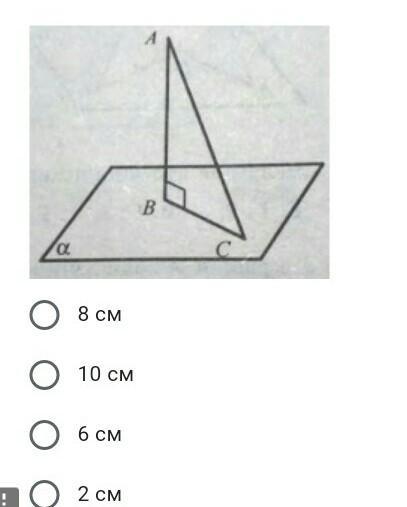 До площини альфа проведено перпендикуляр АВ і похилу АС. Знадіть довжину проекції похилої, якщо АС=10см, АВ=8см.