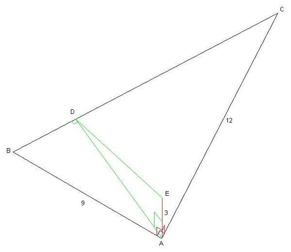 "Катеты прямоугольного треугольника равны 9см и 12см. В вершине прямого угла построен перпендикуляр к плоскости треугольника длиной 3см. Найти расстояния от концов перпендикуляра до гипотенузы. DA. это катет прямоугольного треугольника ADE. Второй катет известен, находишь гипотенузу DE."