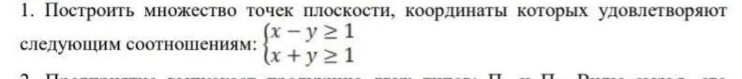 Лень рисовать и фоткать, вот вам просто указание: выразите из каждого неравенства y: y<=x-1, y>=1-x, каждое из неравенств описывает одну из полуплоскостей, на которые разбивает плоскость каждая прямая. Начертите графики прямых y=x-1, y=1-x, знак меньше или равно обозначает все, что ниже или на графике прямой, а знак больше или равно - все, что выше или на графике прямой. Заштрихуйте ту область, которая одновременно ниже прямой y=x-1 и выше прямой y=1-x, это и будет искомое построенное множество