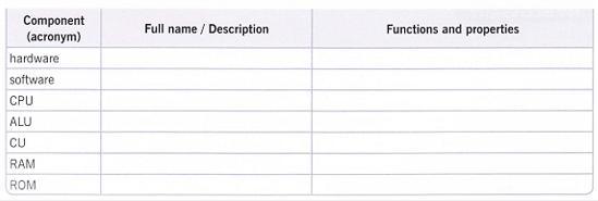 Component (acronym) Full name / Description Functions and properties hardware software CPU ALU cu RAM ROM