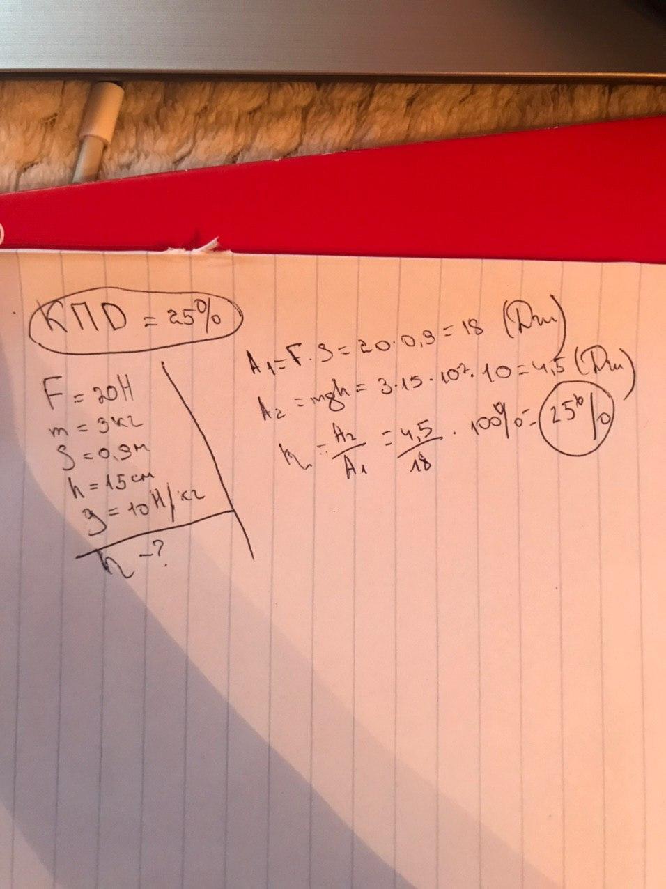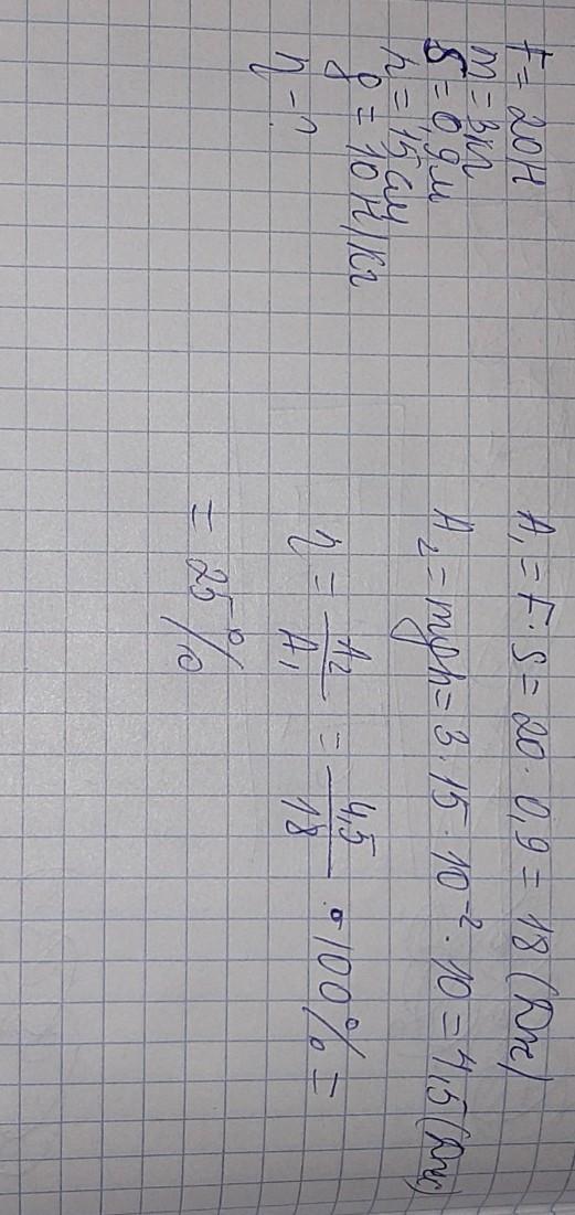 Груз, прикрепленный к динамометру, перемещают с постоянной скоростью вдоль наклонной плоскости. Показания динамометра равны 20 Н. Масса груза равна 3 кг. Длина наклонной плоскости равна 0,9 м, а высота — 15 см. Чему равен КПД такой плоскости? Принять g = 10 Н/кг. Ответ выразить в процентах