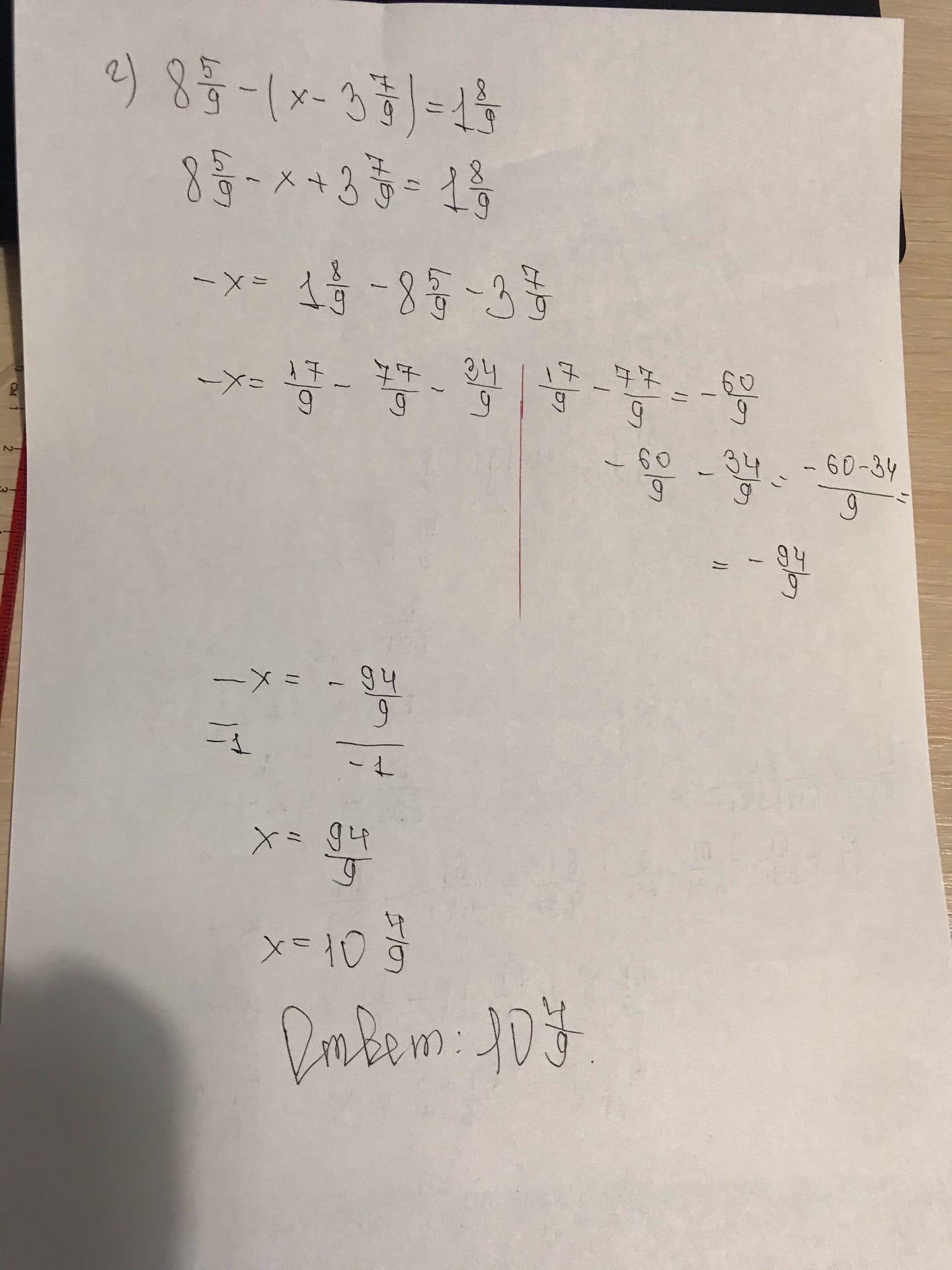 х - 3 7/9 = 8 5/9 - 1 8/9