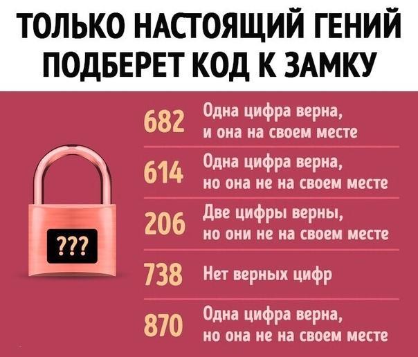 Попробуйте решить задачу, подобрав нужный код для замка! Необходимо написать шаги своего решения, не копируя из Интернета. Если два пользователя добавляют ответ, то решения обязательно должны быть различными! Желаю Удачи! Гении, вперёд! :)))