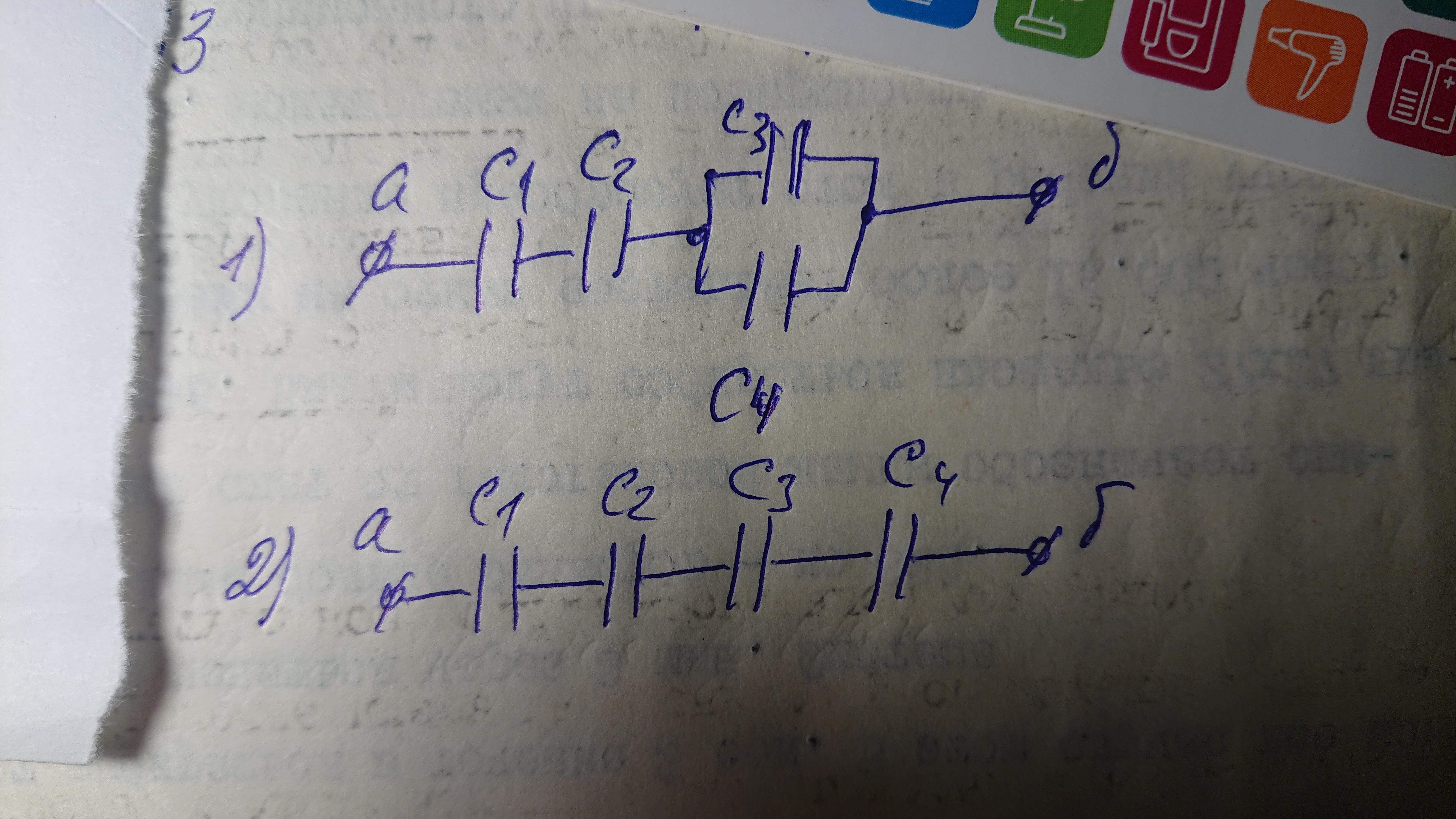 3. Начертить схемы присоединения четырех конденсаторов к выводам а) и б) источника переменного напряжения 1) последовательно соединены 2 конденсатора, параллельно – 2 конденсатора; 2) последовательно соединены все конденсаторы.