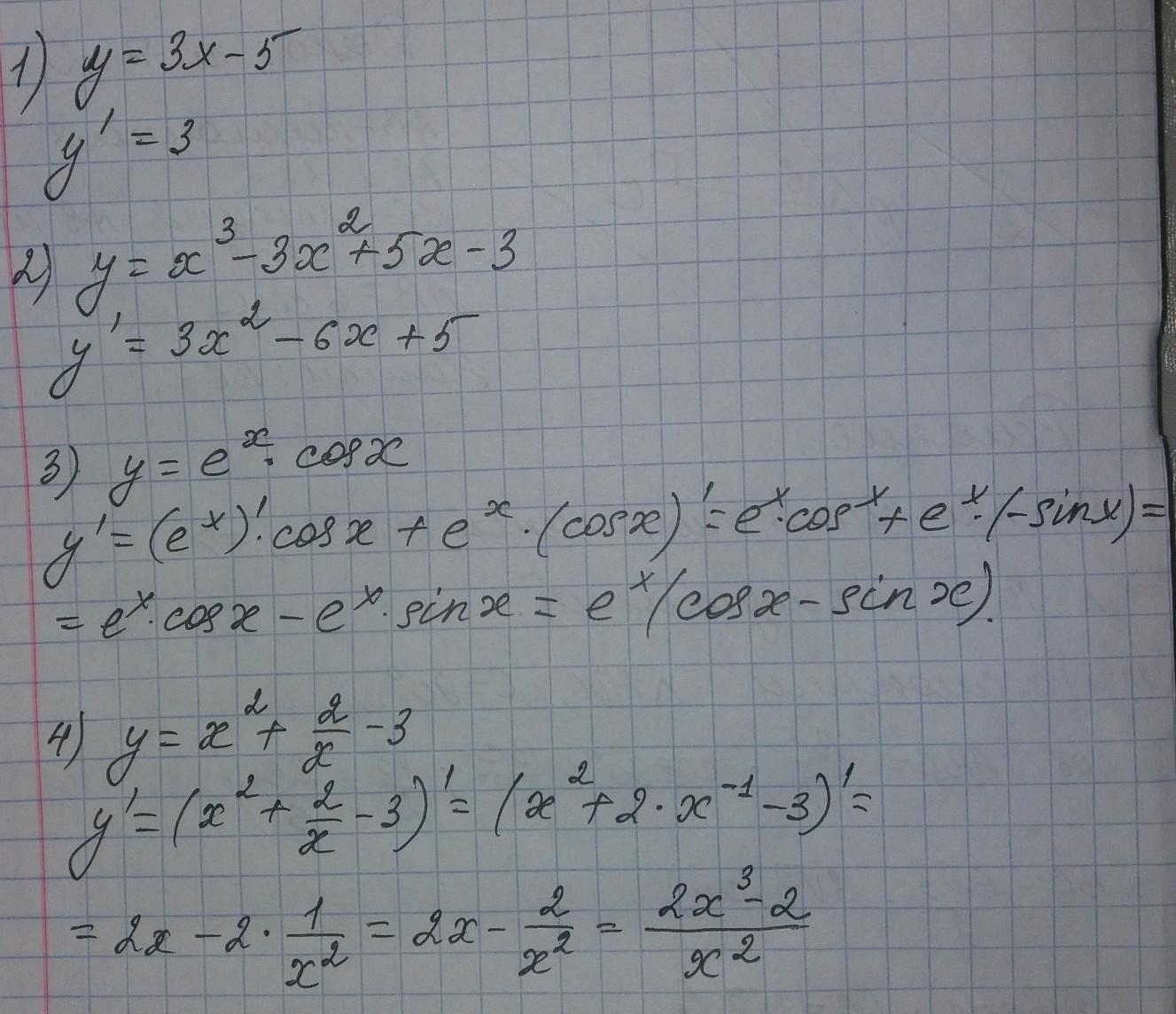Найти производные функции: 1) y=3x-5 2) y=x^3-3x^2+5x-3 3) y=e^x * cosx 4) y=x^2+2/x-3