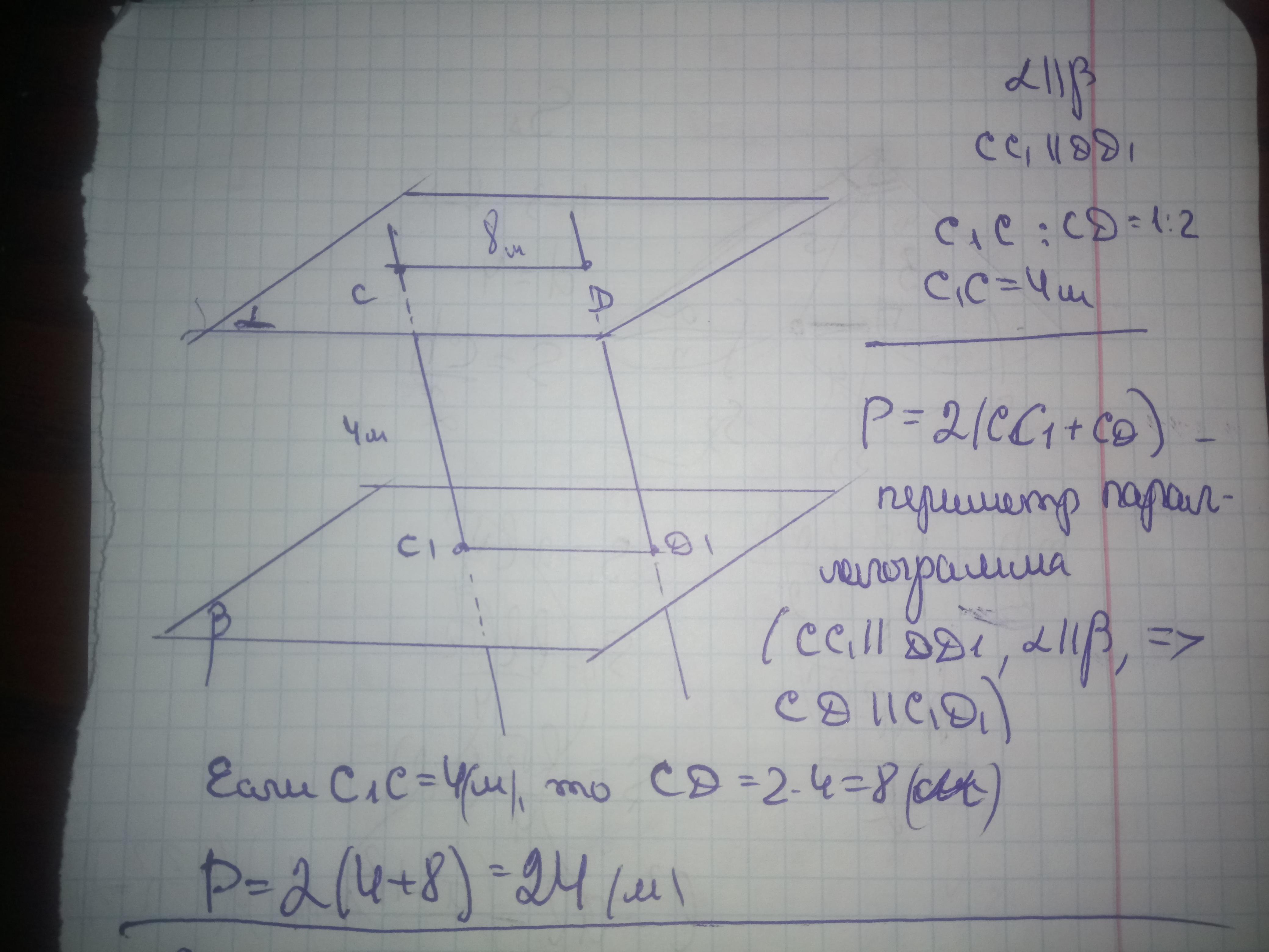 Плоскости a и b параллельны. Через точки C и D плоскости a проведены параллельные прямые, которые пересекают плоскость b соответственно в точках C1 и D1 . Найдите периметр C1 C D D1 , если C1 C:C D= 1:2 ,C1 C=4м.