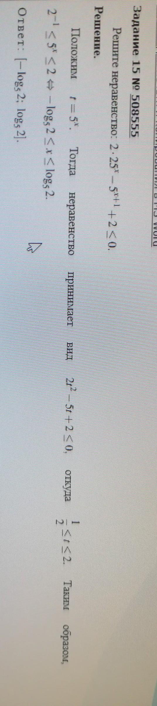 Объясните, пожалуйста, последний момент, где 2^-1 < 5^х < 2 выразили в виде логарифмов.