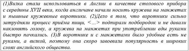 (1)Вилка стала использоваться в Англии в качестве столового прибора с середины XVII века, когда англичане начали носить кружева на манжетах и пышные кружевные воротники. (2)Дело в том, что воротники сильно затрудняли процесс приёма пищи, <…> подпирали подбородок и не давали наклонять голову, а кружева на манжетах при употреблении еды руками быстро пачкались. (3)В воротнике и с манжетами было удобнее есть не руками, а вилкой, поэтому она скоро завоевала популярность в широких слоях английского общества.