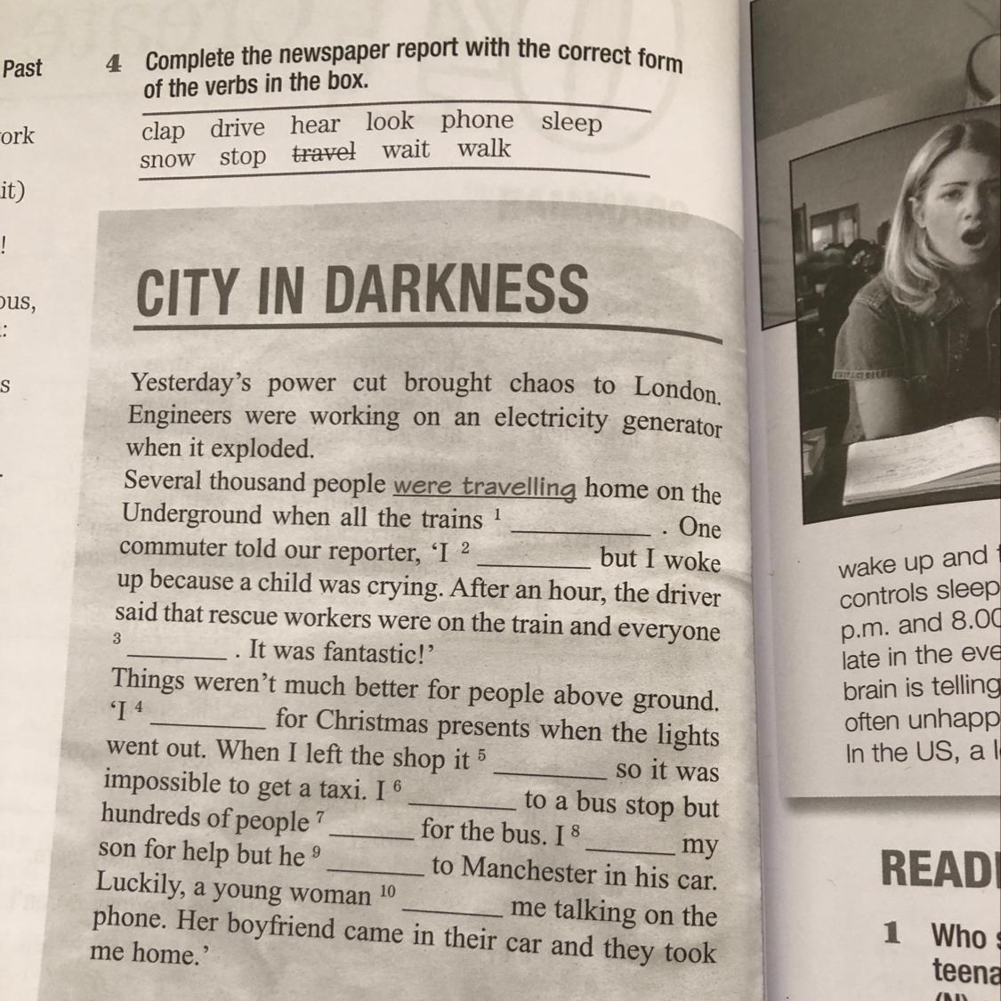 Things weren’t much better for people above ground. ‘I 5) was looking for Christmas presents when the lights went out. When I left the shop, it 6) was snowing, so it was impossible to get a taxi. I 7) walked to a bus stop, but hundreds of people 8) were waiting for the bus. I 9) phoned my son for help, but he 10) was driving to Manchester in his car. Luckily a young woman 11) heard me talking on the phone. Her boyfriend came in their car and they took me home.’