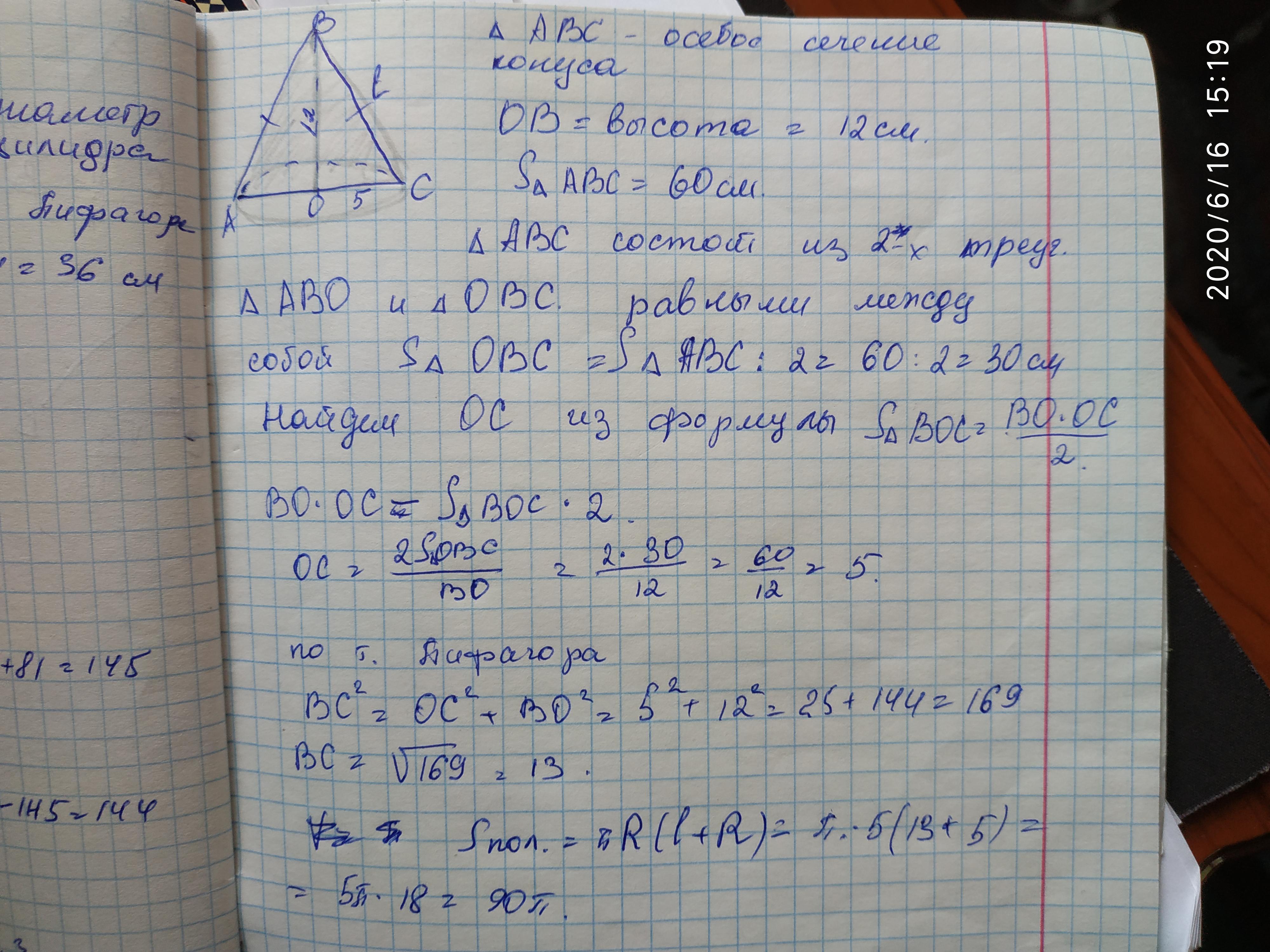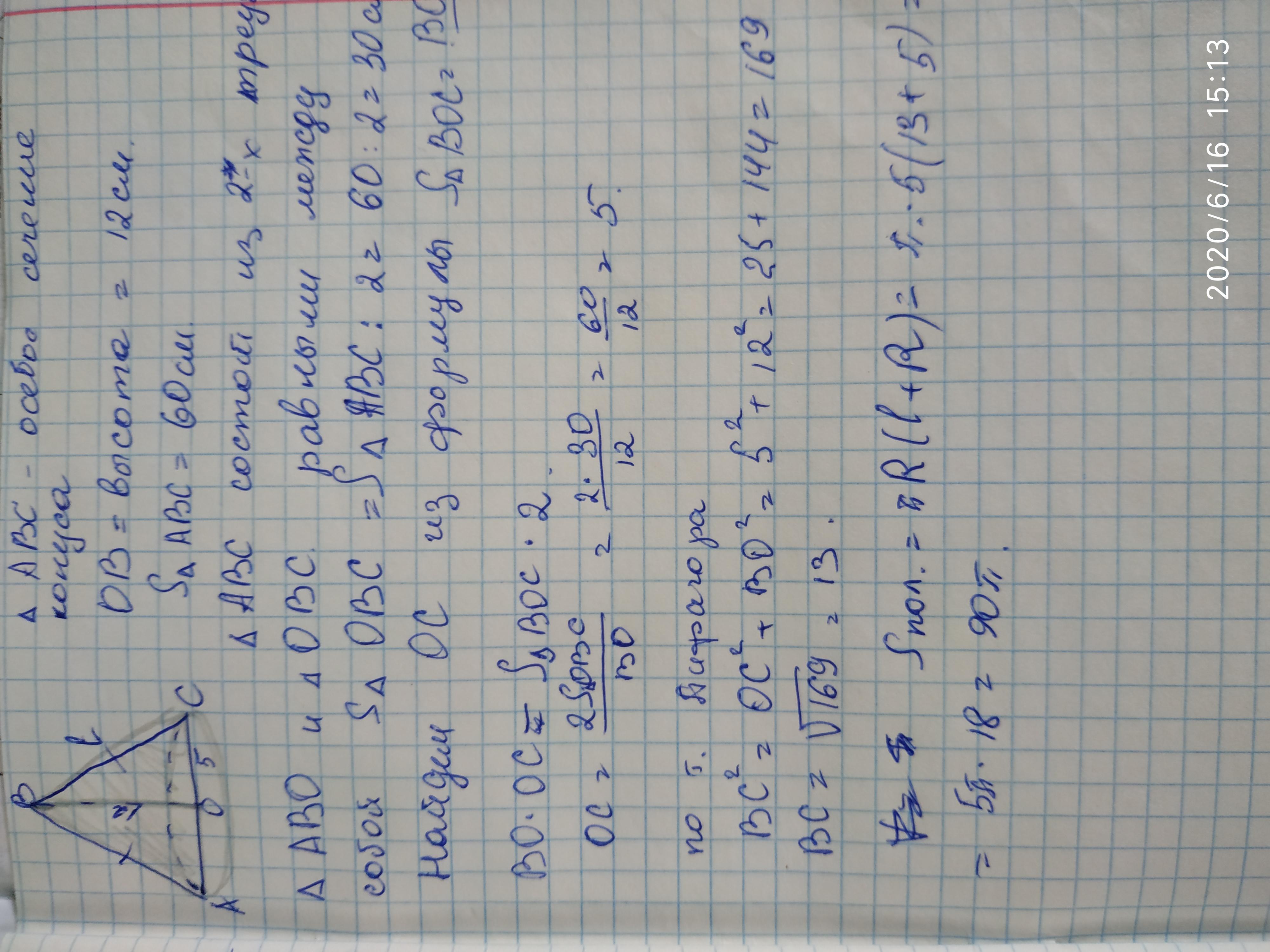 Осевое сечение конуса равнобедренный треугольник площадь которого равна 60см², высота конуса 12см. Найдите площадь полной поверхности конуса.