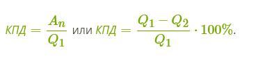 1)Отношение совершённой полезной работы двигателя к энергии, полученной от нагревателя, называют коэффициентом полезного действия теплового двигателя. КПД теплового двигателя определяют по формуле: КПД = A n Q 1 или КПД = (Q 1 − Q 2)/Q 1 ⋅ 100 % (вторая фотка)