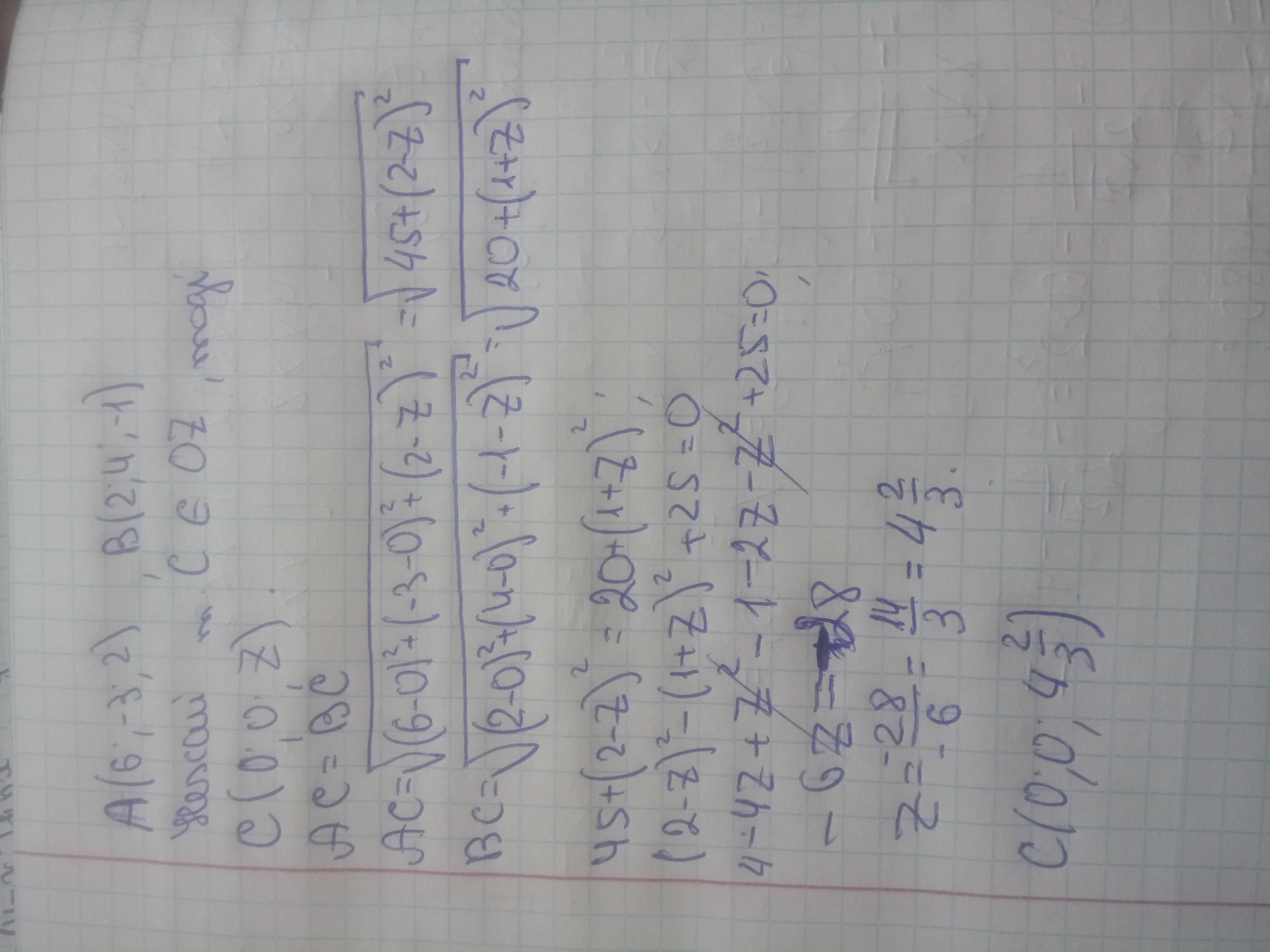 Знайдіть на осі z точку, яка рівновіддалена від точок A(6;−3;2) і B(2;4;−1).помогите пожалуйста очень надо