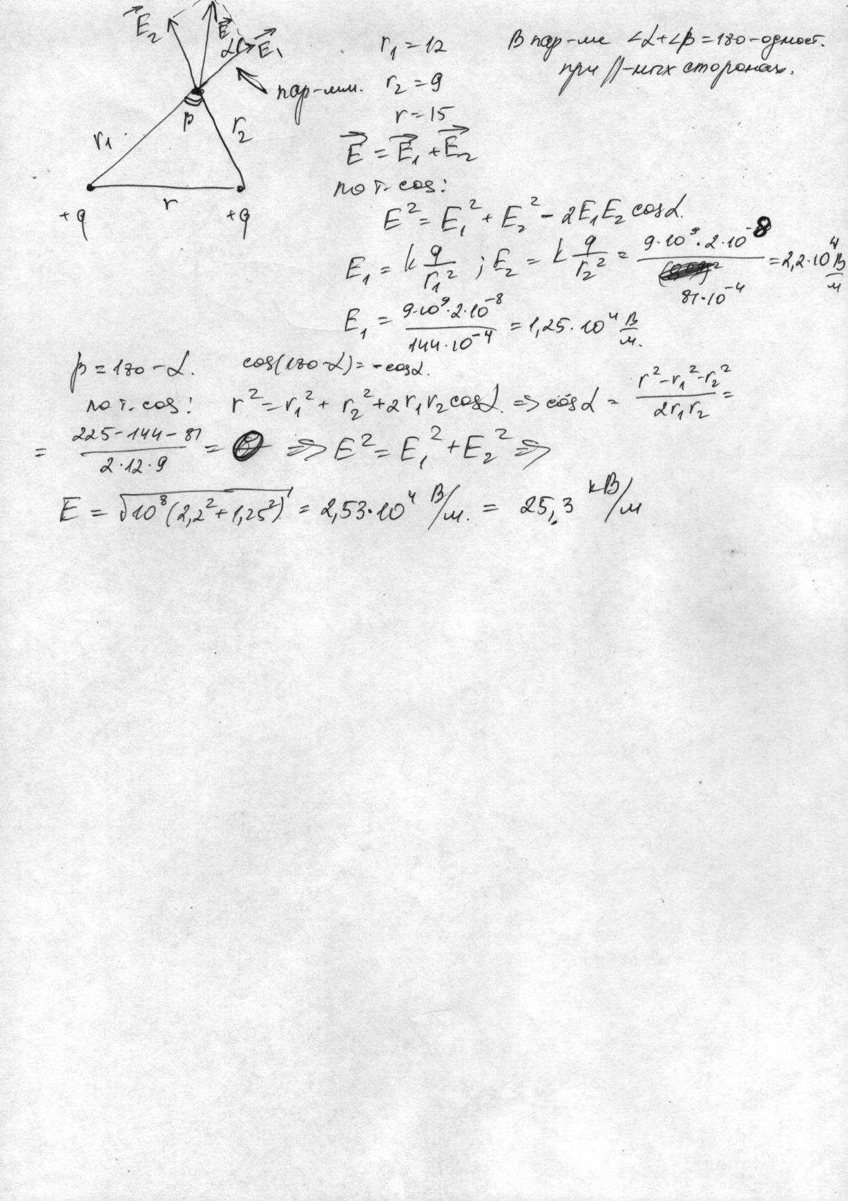Два точечных одноимённых заряда по 2·10 в -8 степени Кл каждый находятся на расстоянии 15 см друг от друга. Определите напряжённость поля в точке, находящейся на расстоянии 12 см от первого заряда и 9 см от второго заряда.