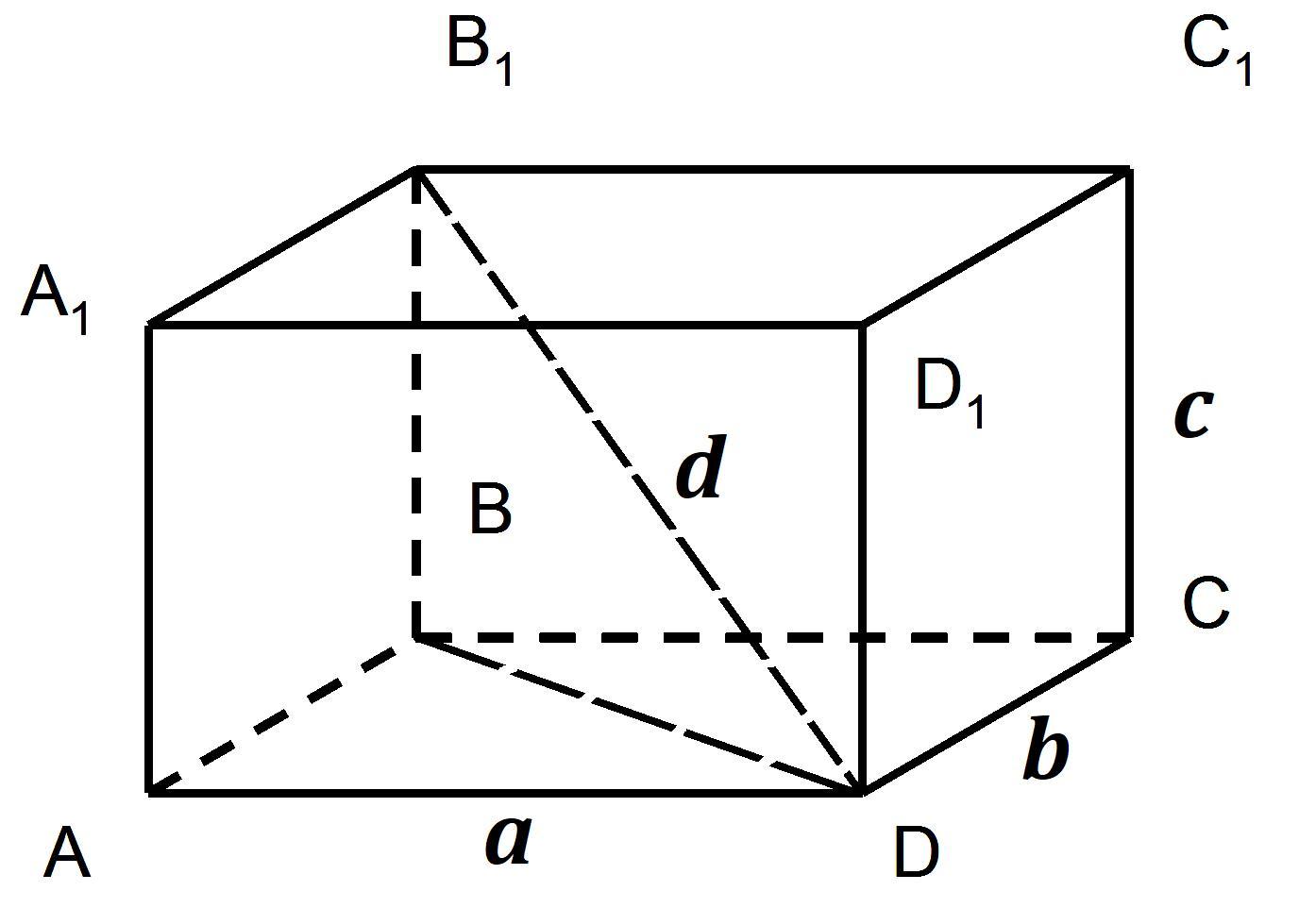 "Квадрат диагонали прямоугольного параллелепипеда равен квадратам 3 его измерений". (d = √(a² + b² + c²), где d - диагональ; а, b, c - 3 его измерения)