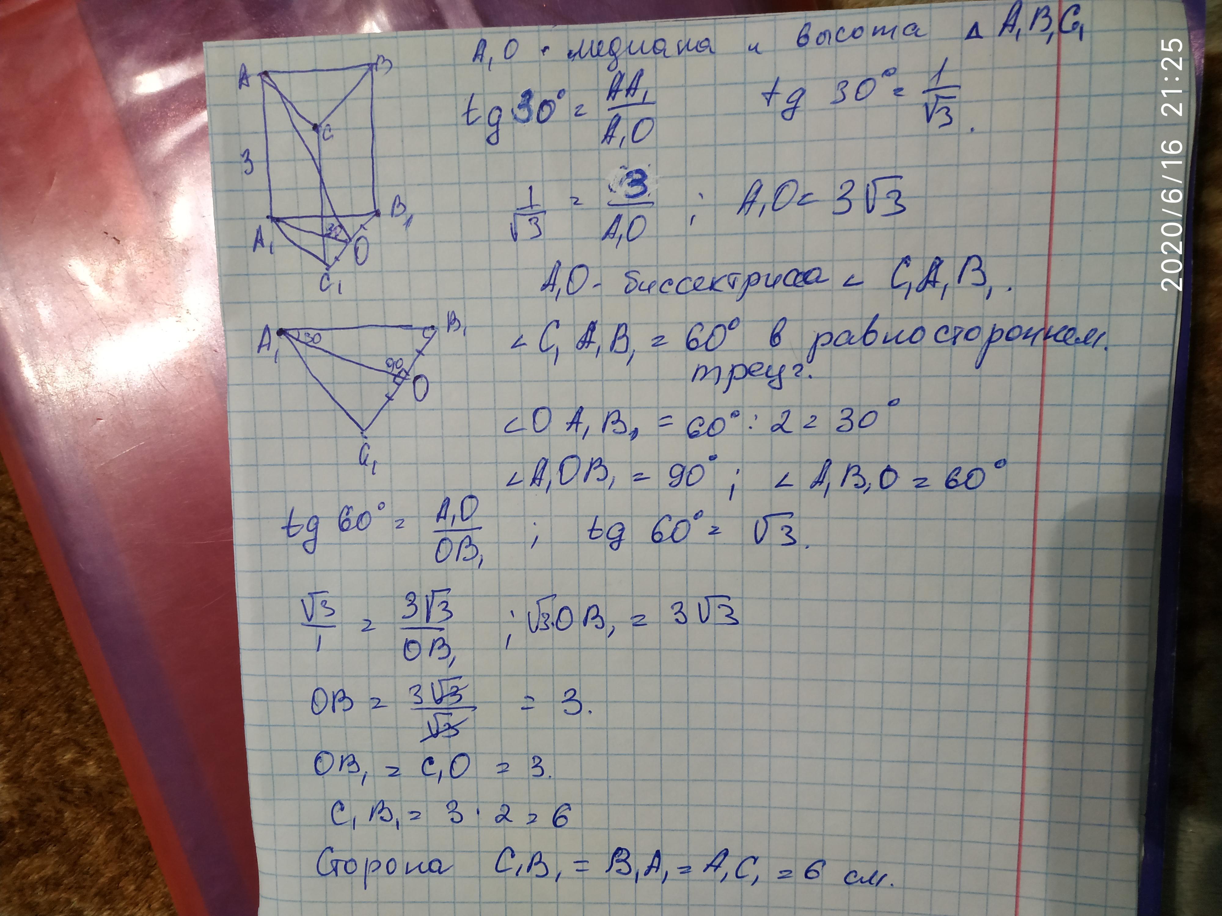 Дана правильная треугольная призма с высотой 3 см. В призме проведён отрезок, соединяющий вершину верхнего основания и середину противолежащего ей ребра нижнего основания. Угол между отрезком и плоскостью основания 30 градусов. Найти сторону основания призмы.