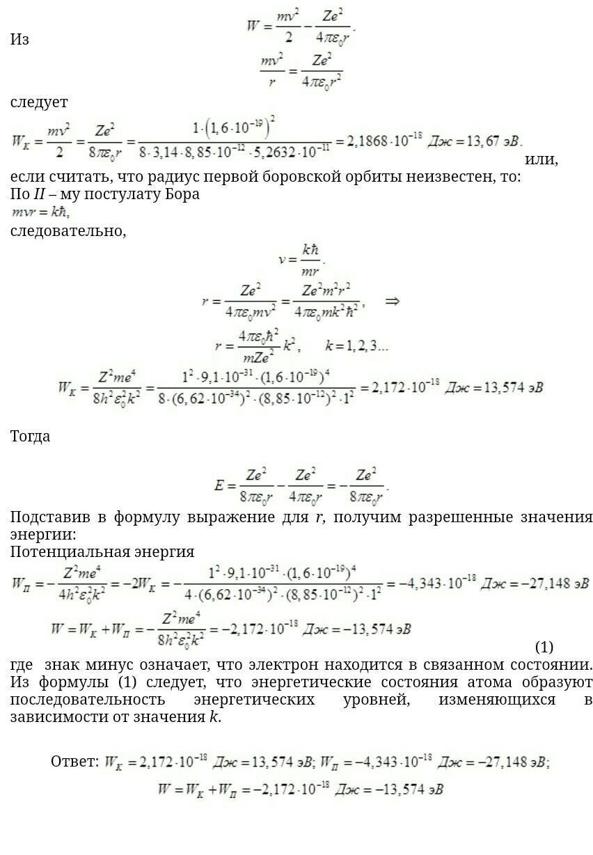 Вычислить кинетическую Wк, потенциальную Wп и полную W энергии электрона на первой боровской орбите.