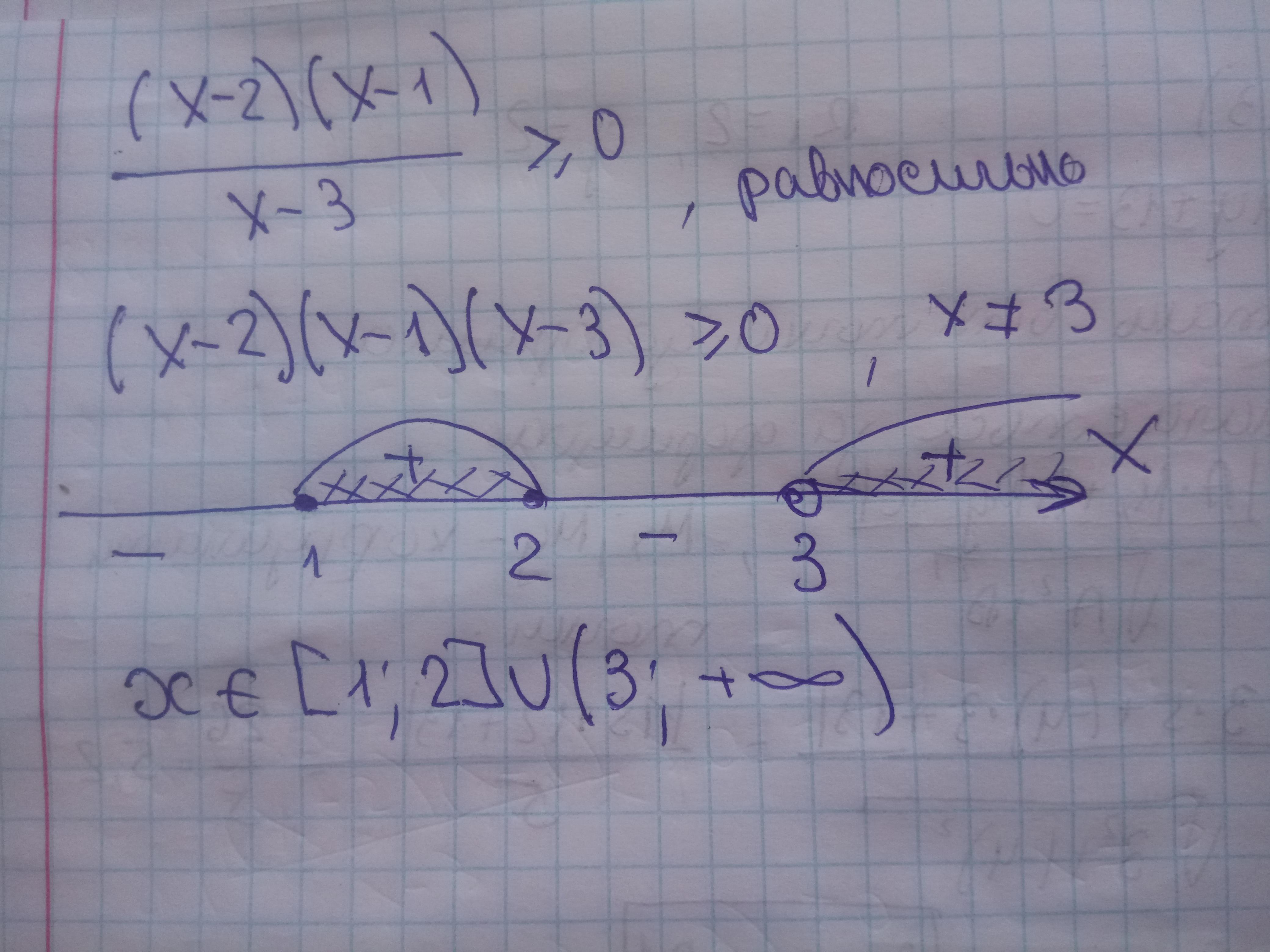 На оси Х отметим точки 1, 2, 3. При этом х не может быть равно 3.