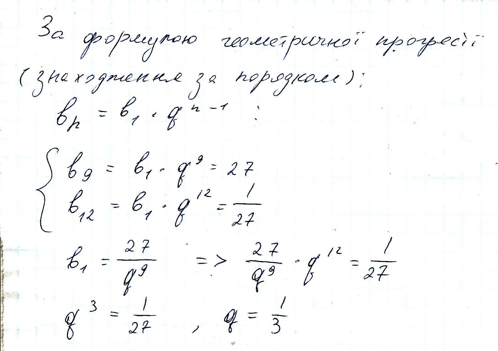 у геометричній прогресії b9=27, b12=1/27, знайти q.