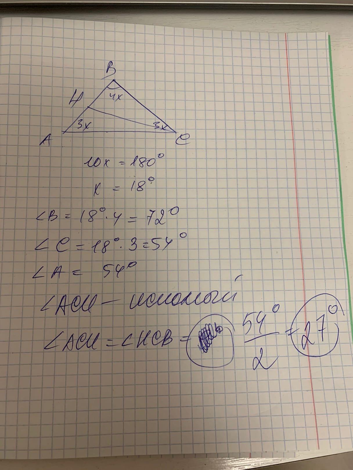 В равнобедренном треугольнике АВС с вершиной В углы С и В относятся как 3:4 соответственно. Найдите угол между биссектрисой СК и стороной СА