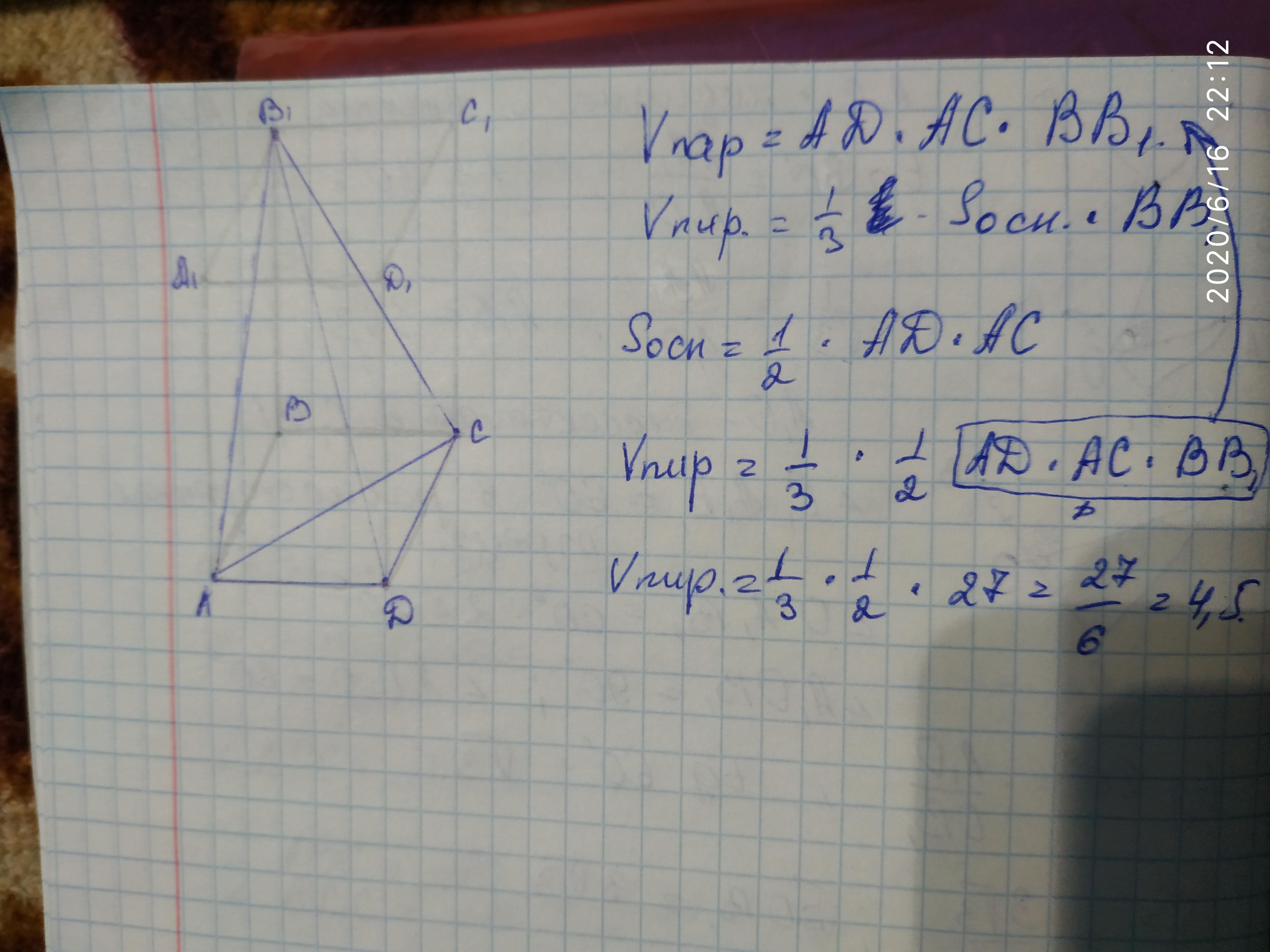 Объѐм параллелепипеда ABCDA1B1C1D1 равен 27. Найдите объѐм треугольной пирамиды ACDB1. Помогите пожалуйста, даю 30 б.