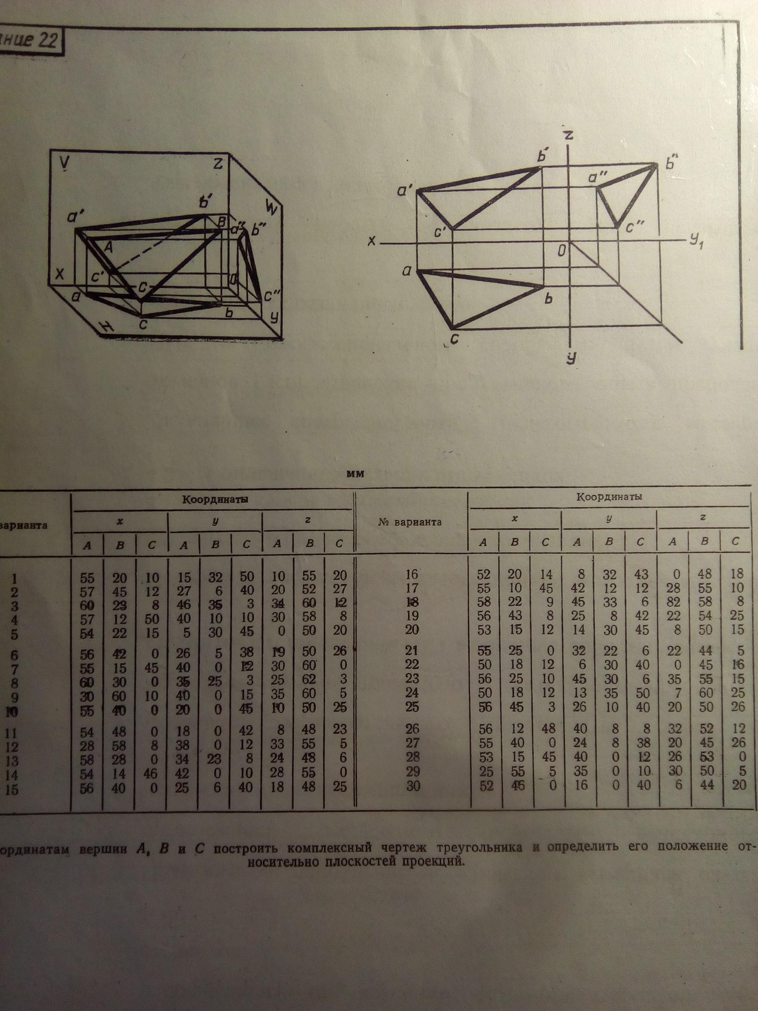 В нижней части листа я выписала координаты точек А,В,С для варианта №11. Проведите две взаимно перпендикулярные оси и обозначьте х, у, у₁, z. Длину каждой из осей выберите 70 мм.