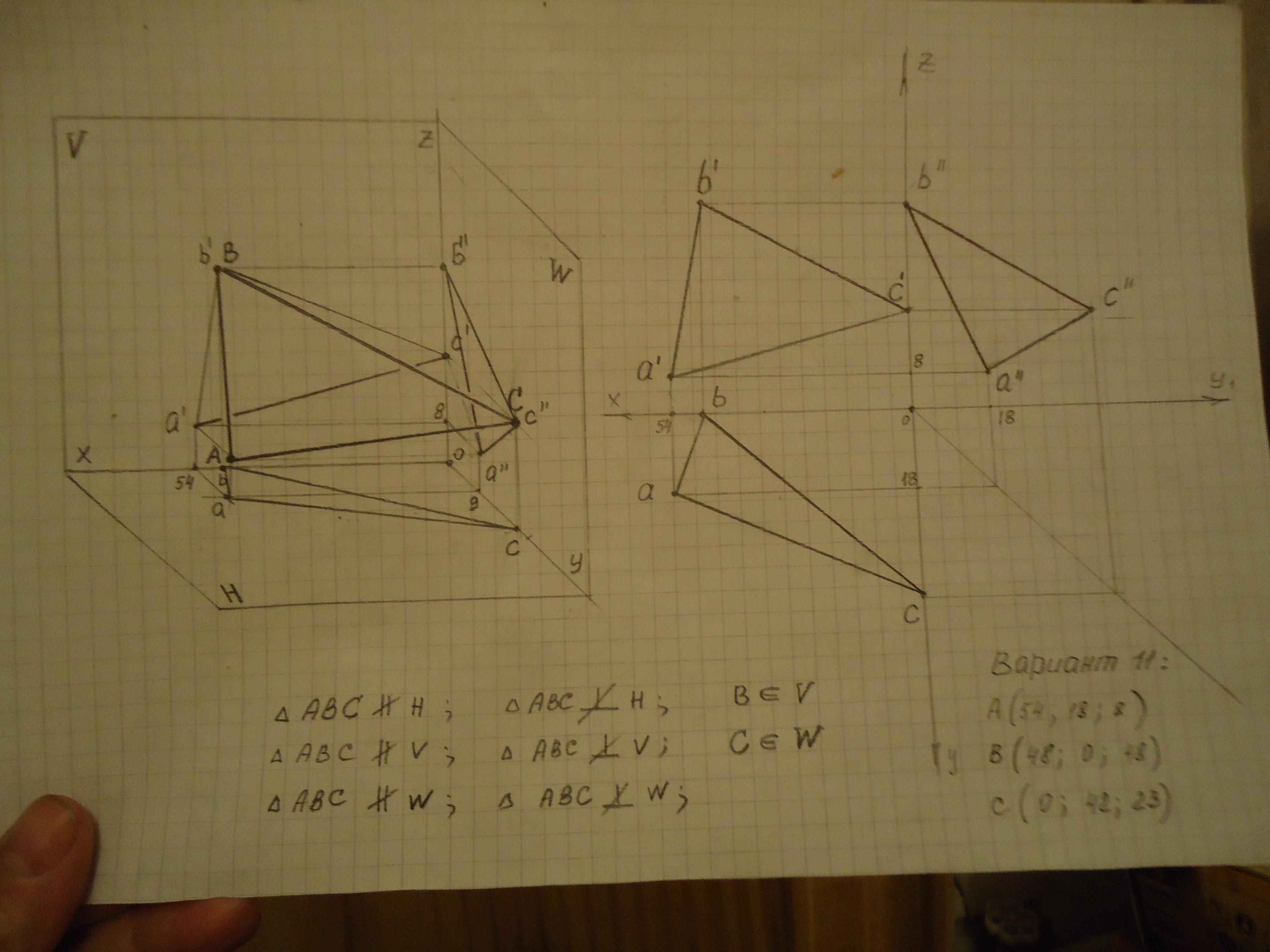 Внизу листа я записала, что ΔАВС не параллелен плоскостям проекций и не перпендикулярен им, но точка В∈V и С∈W.