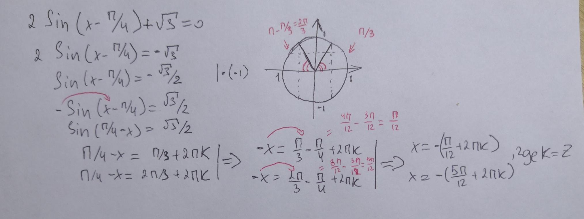 x-π/4=(-1)ⁿarcsin(-√3/2)+πn; n∈Z