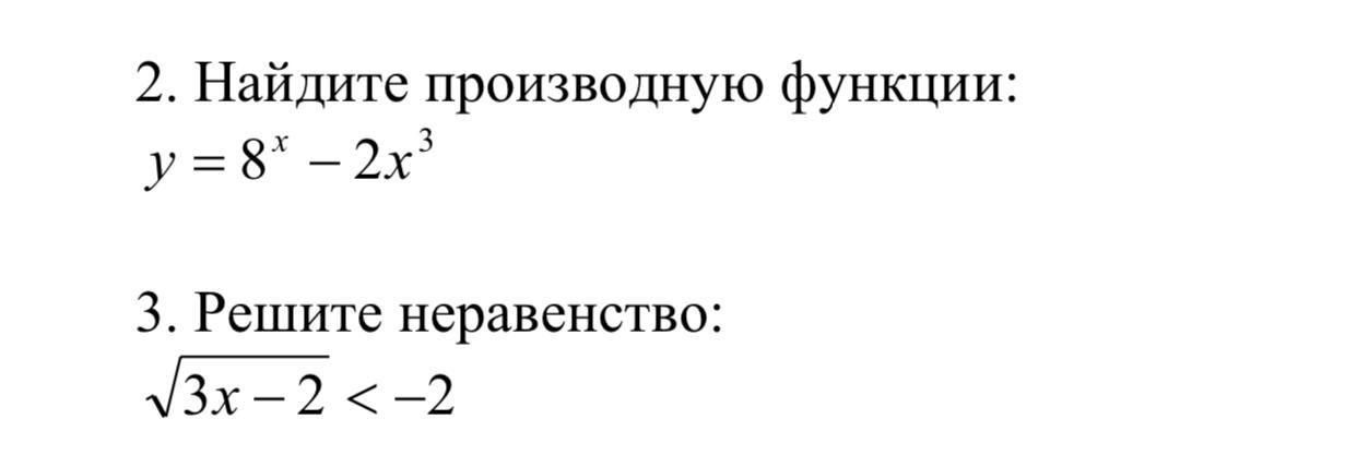 Найти производную функции y=8^x-2x^3 Решить неравенство .корень из 3x-2 меньше -2