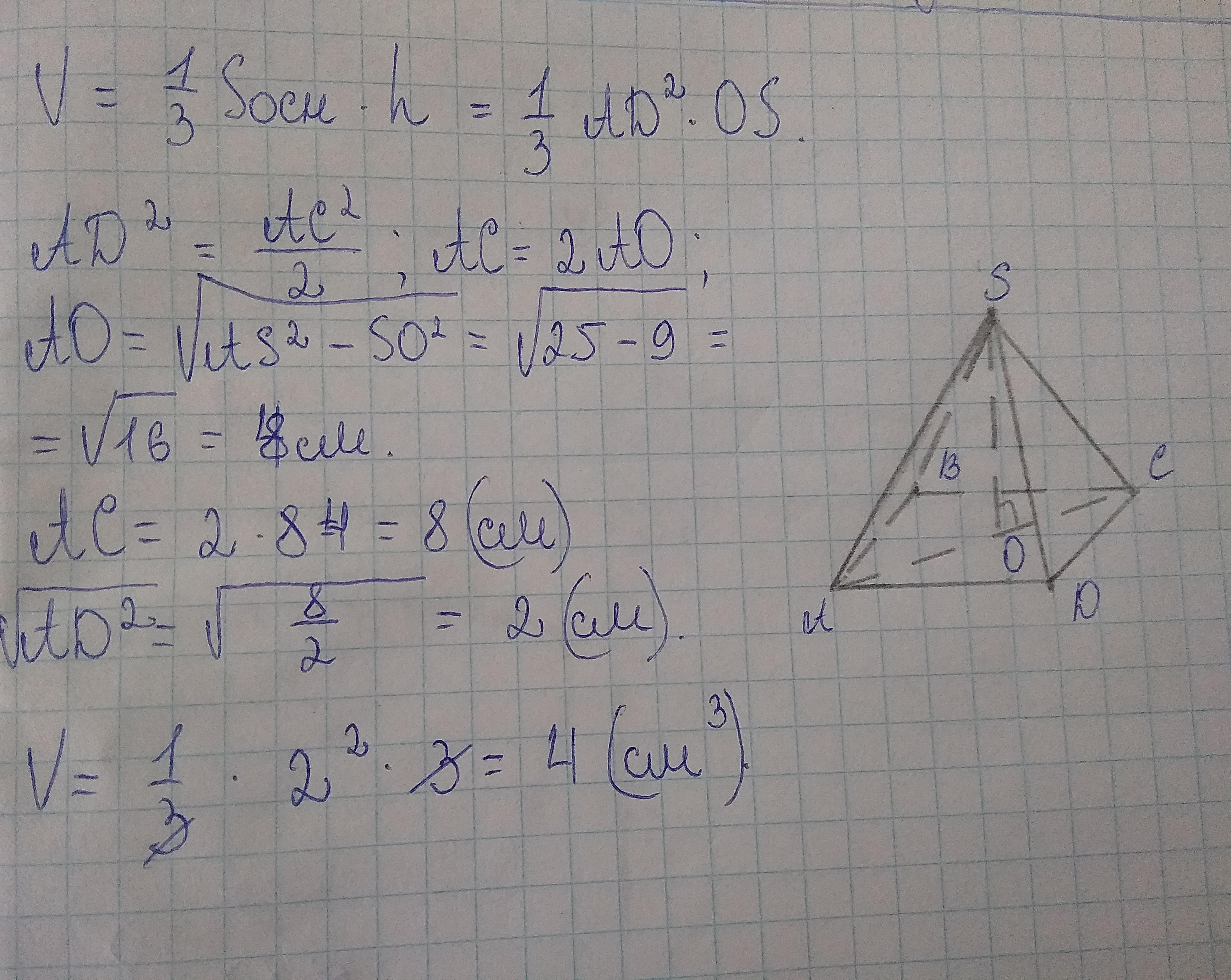 в правильной четырёх угольной пирамиде высота 3 см, боковое ребро 5 см, найдите объем пирамиды