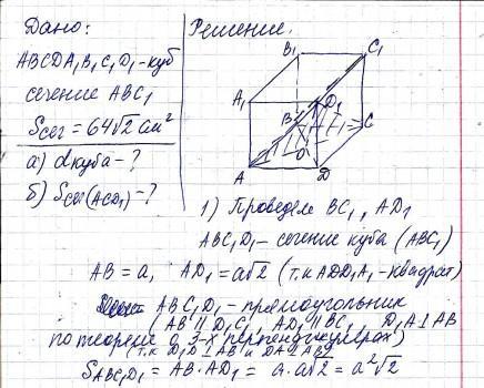 см^2 . Найдите: а) диагональ куба б) площадь сечения куба плоскостью ACD 1
