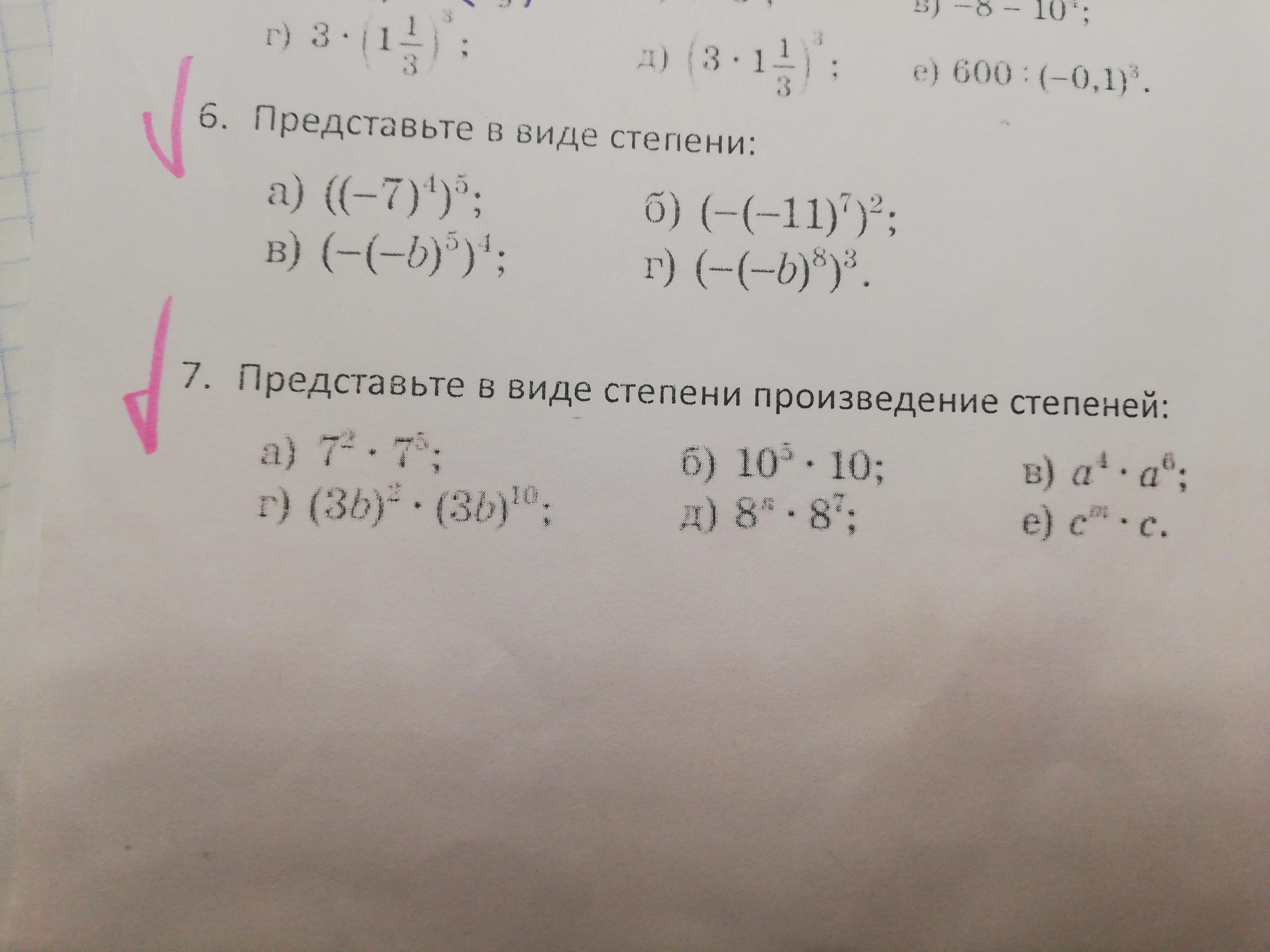 - а) ((-7⁴)⁵=7²⁰ б)(-(-11)⁷)²=7¹⁴ в)(-(-b)⁵)⁴=b²⁰ г)(-(-b)⁸)³=b⁶