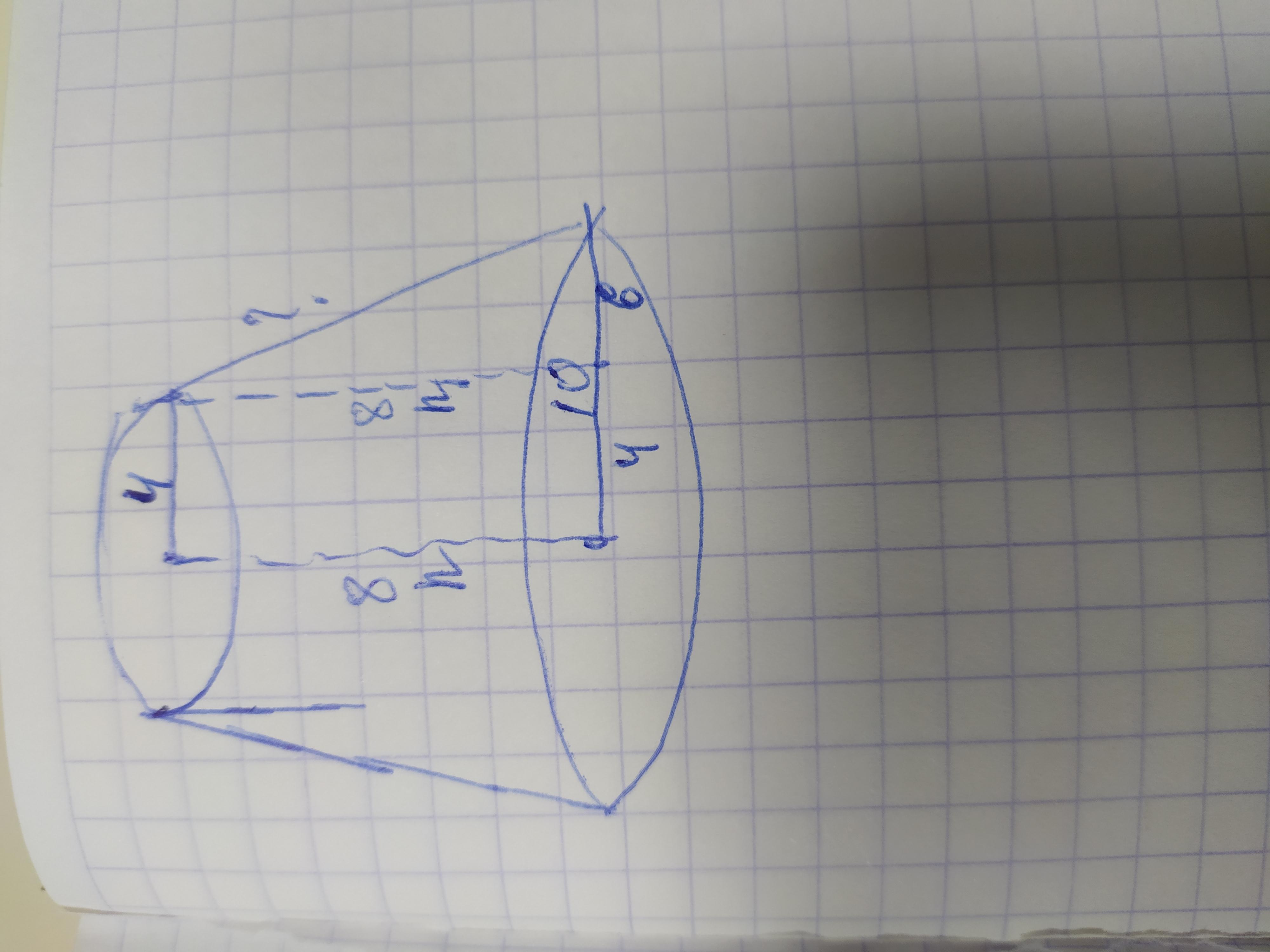 Объяснение: обозначим высоту конуса h. Высота вместе с радиусами оснований и образующей образуют прямоугольную трапецию с основаниями равными радиусам и боковыми сторонами, которыми являются высота и образующая. Проведём высоту h1 от радиуса верхнего основания к нижнему. Получился прямоугольник со сторонами 8см и 4см, в котором часть радиуса нижнего основания равна радиусу верхнего основания, поэтому вторая часть радиуса, которая образуется приделении высотой h1 равна 10-4=6. Также образуеться прямоугольный треугольник, в котором высота и часть нижнего радиуса являются катетами а образующая гипотенузой. Найдём образующую по теореме Пифагора: