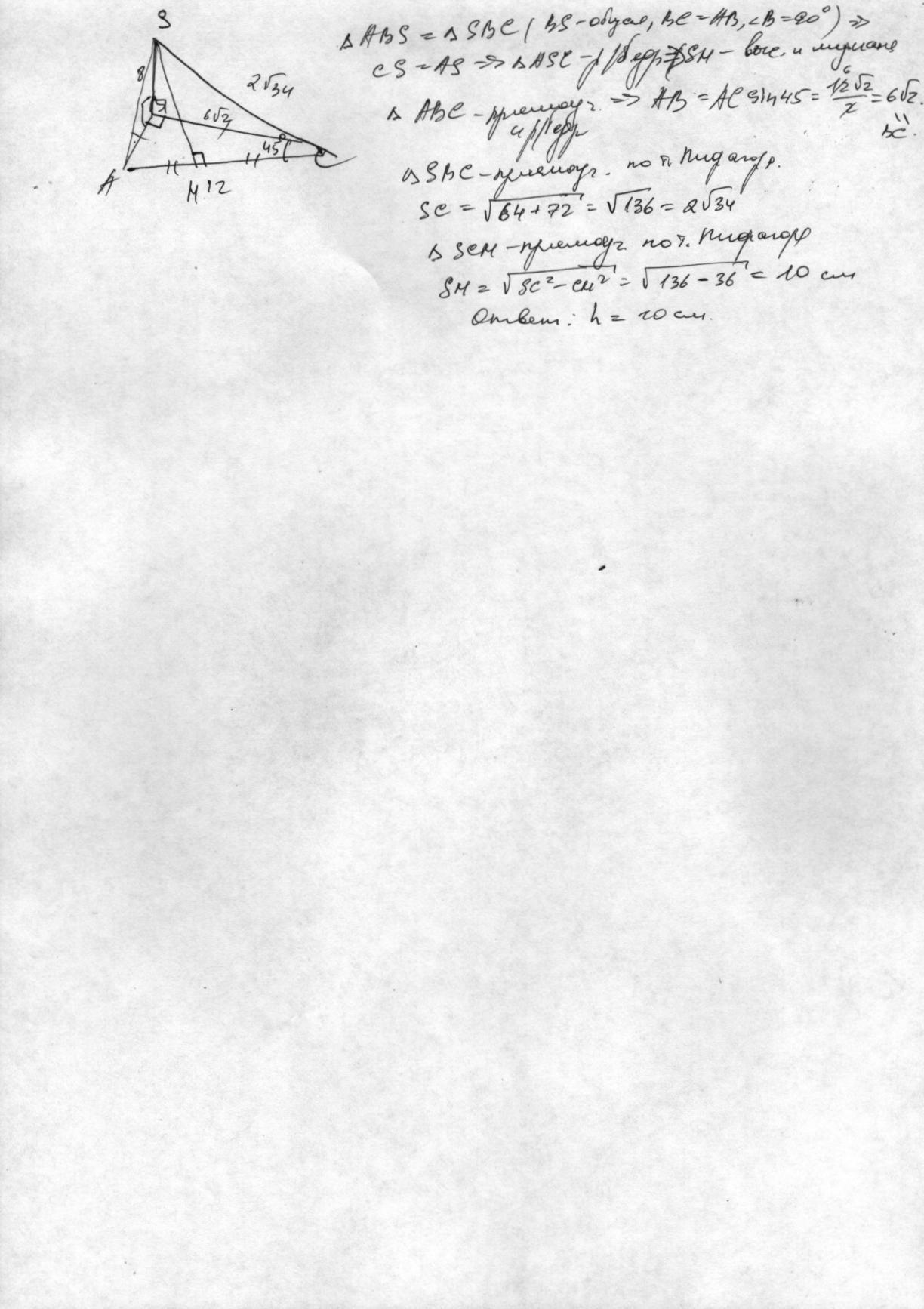 Основанием пирамиды служит равнобедренный прямоугольный треугольник с гипотенузой 12 см. Высота проходит через вершину прямого угла и равна 8 см. Найти расстояние от вершины пирамиды до большей стороны основания.